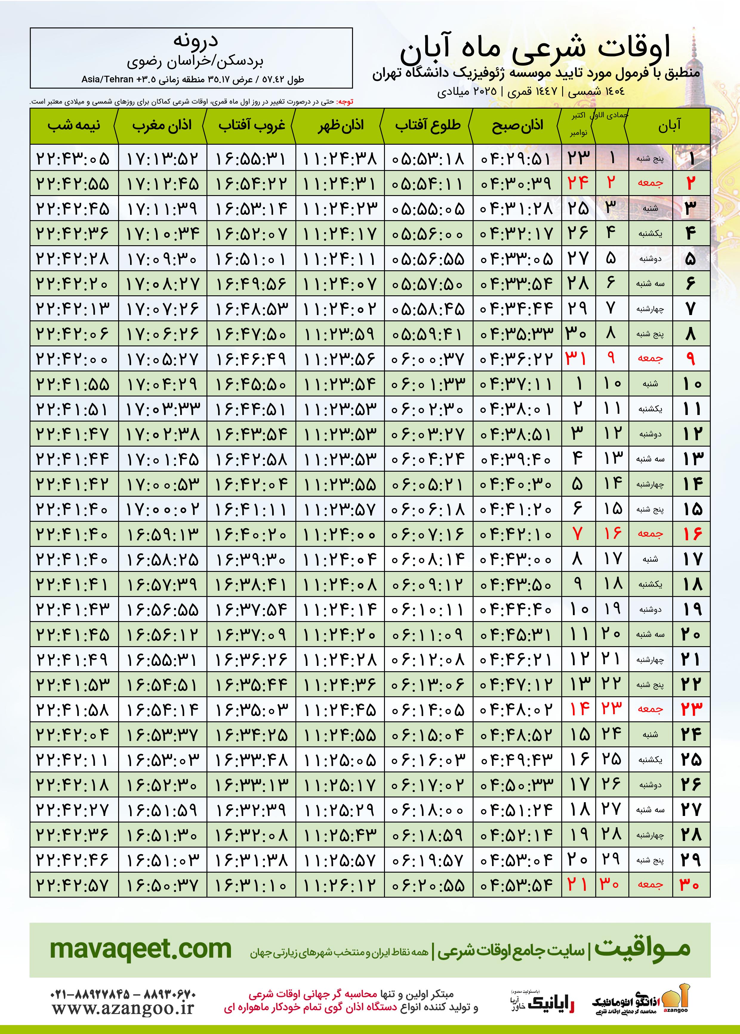 جدول اوقات شرعی آبان ١٤٠٤ شمسی شهر درونه