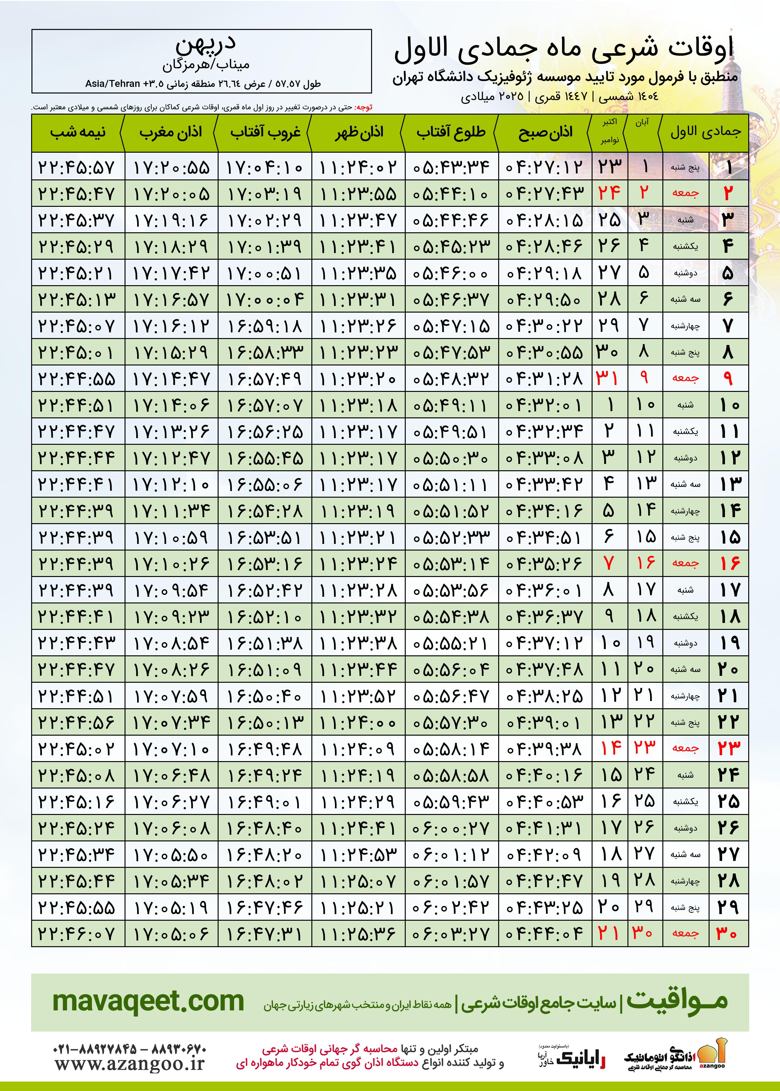 اوقات شرعی ماه جمادی الاول ١٤٤٧ هـ.ق شهر درپهن بر