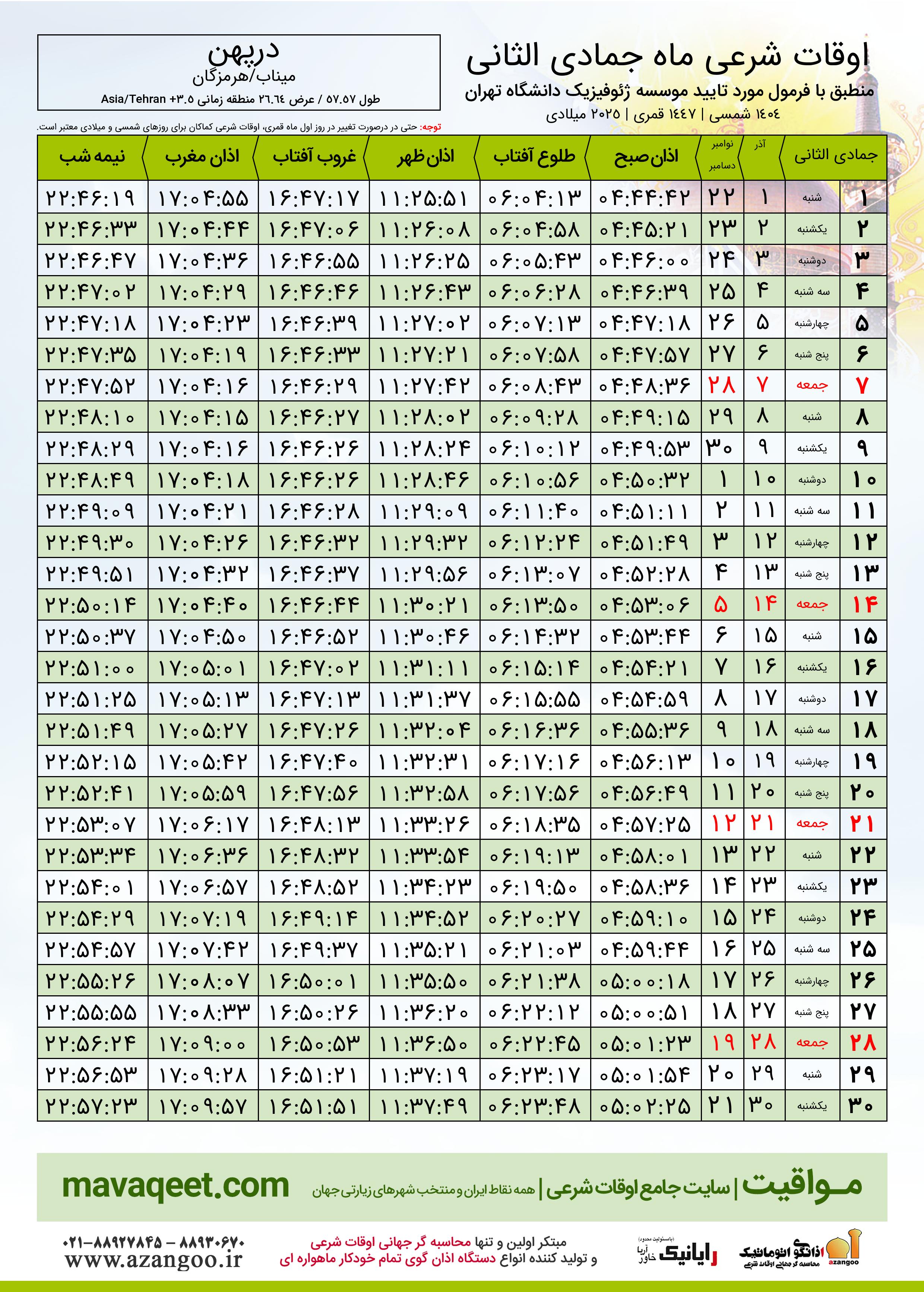 اوقات شرعی ماه جمادی الثانی ١٤٤٧ هـ.ق شهر درپهن بر