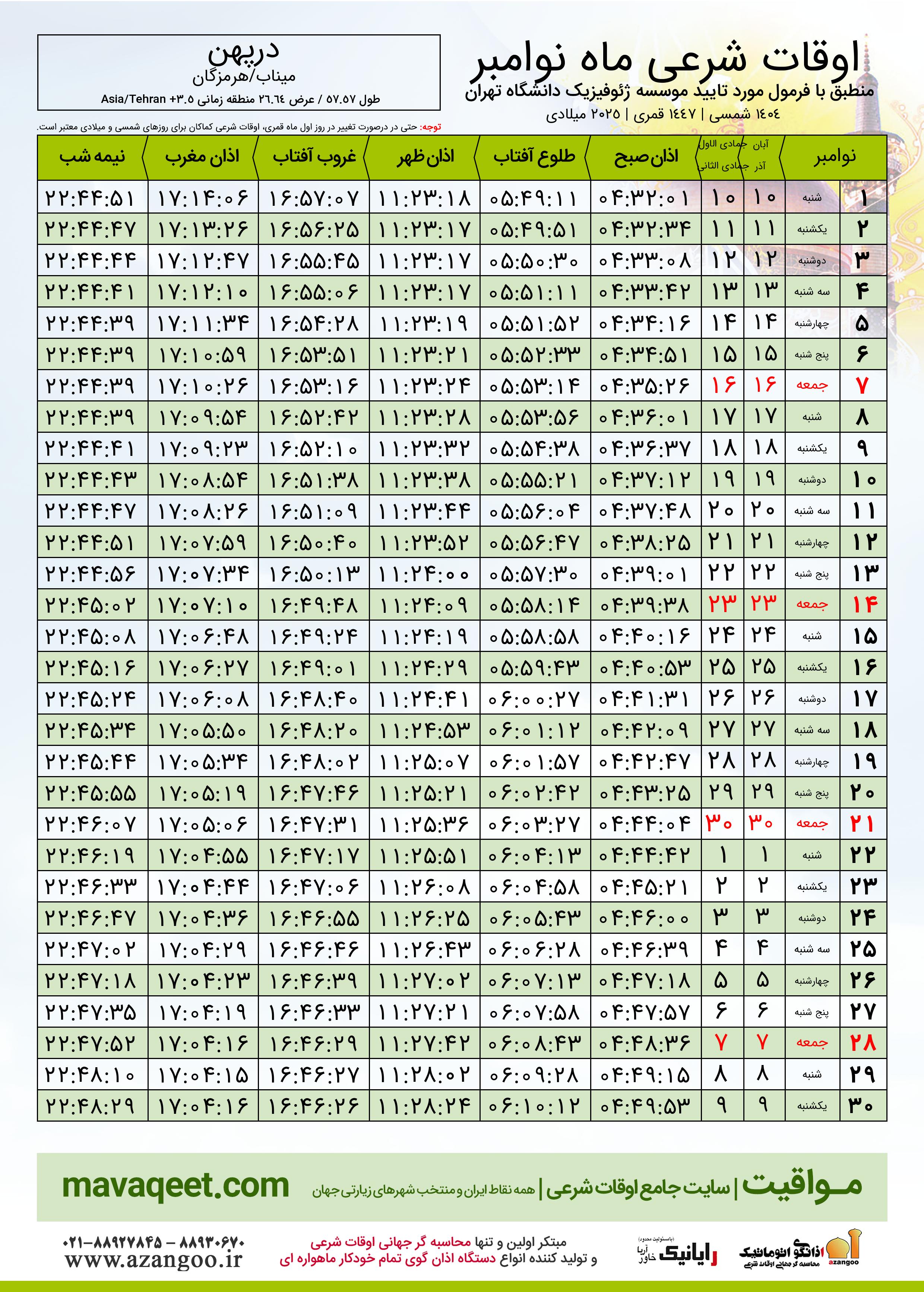 جدول اوقات شرعی نوامبر ٢٠٢٥ میلادی شهر درپهن