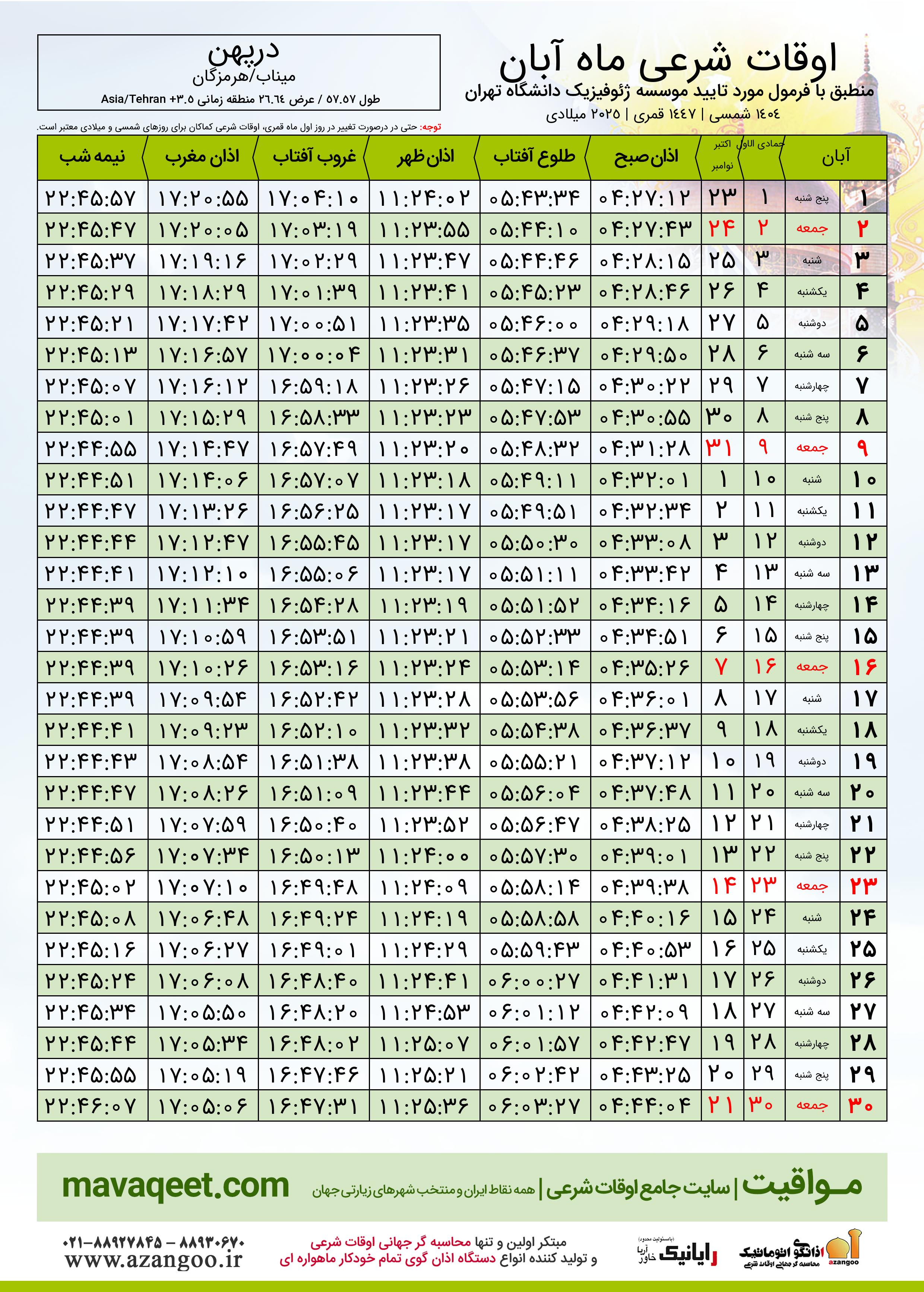 جدول اوقات شرعی آبان ١٤٠٤ شمسی شهر درپهن
