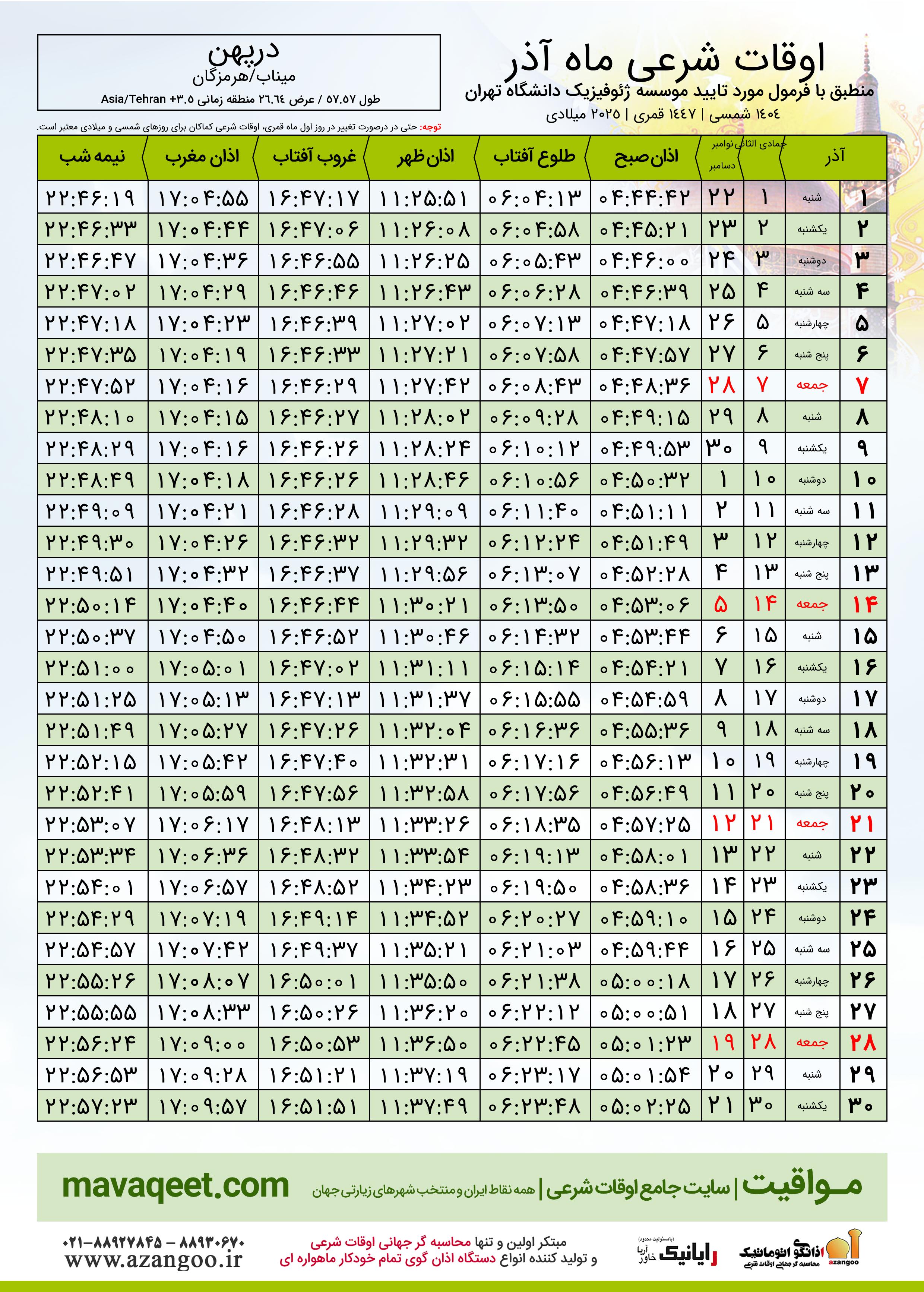 جدول اوقات شرعی آذر ١٤٠٤ شمسی شهر درپهن