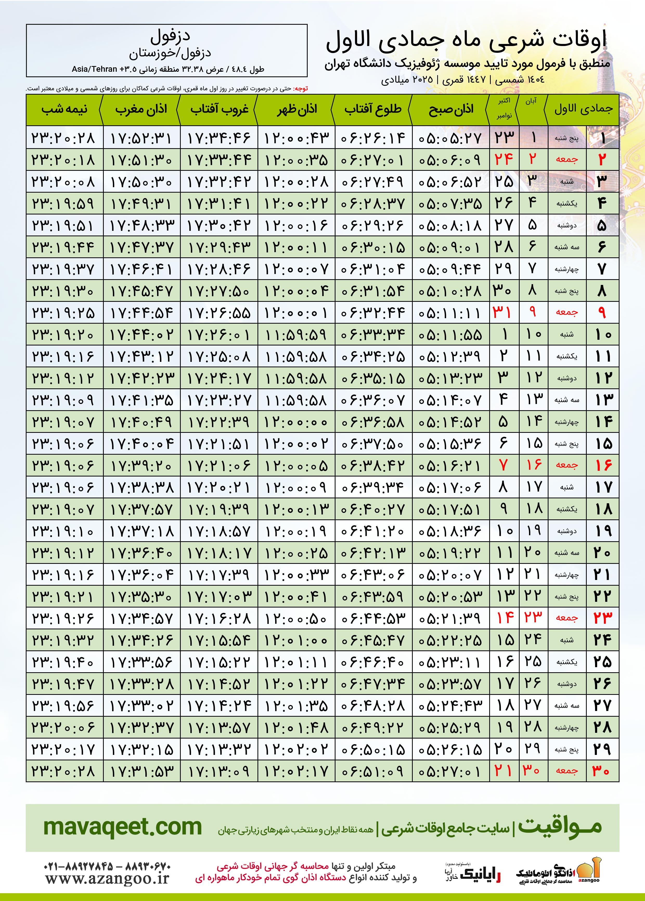 اوقات شرعی ماه جمادی الاول ١٤٤٧ هـ.ق شهر دزفول بر