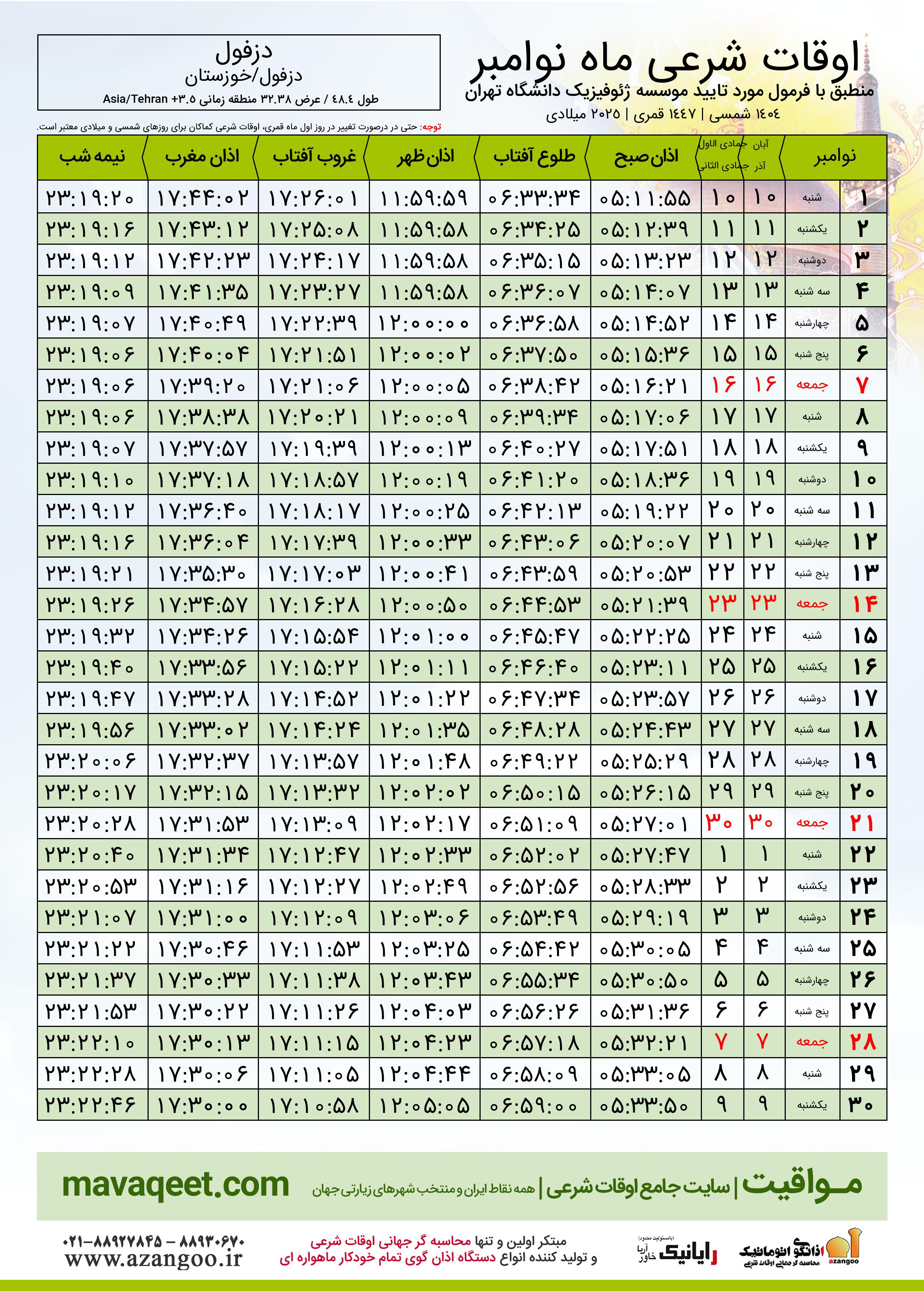 جدول اوقات شرعی نوامبر ٢٠٢٥ میلادی شهر دزفول