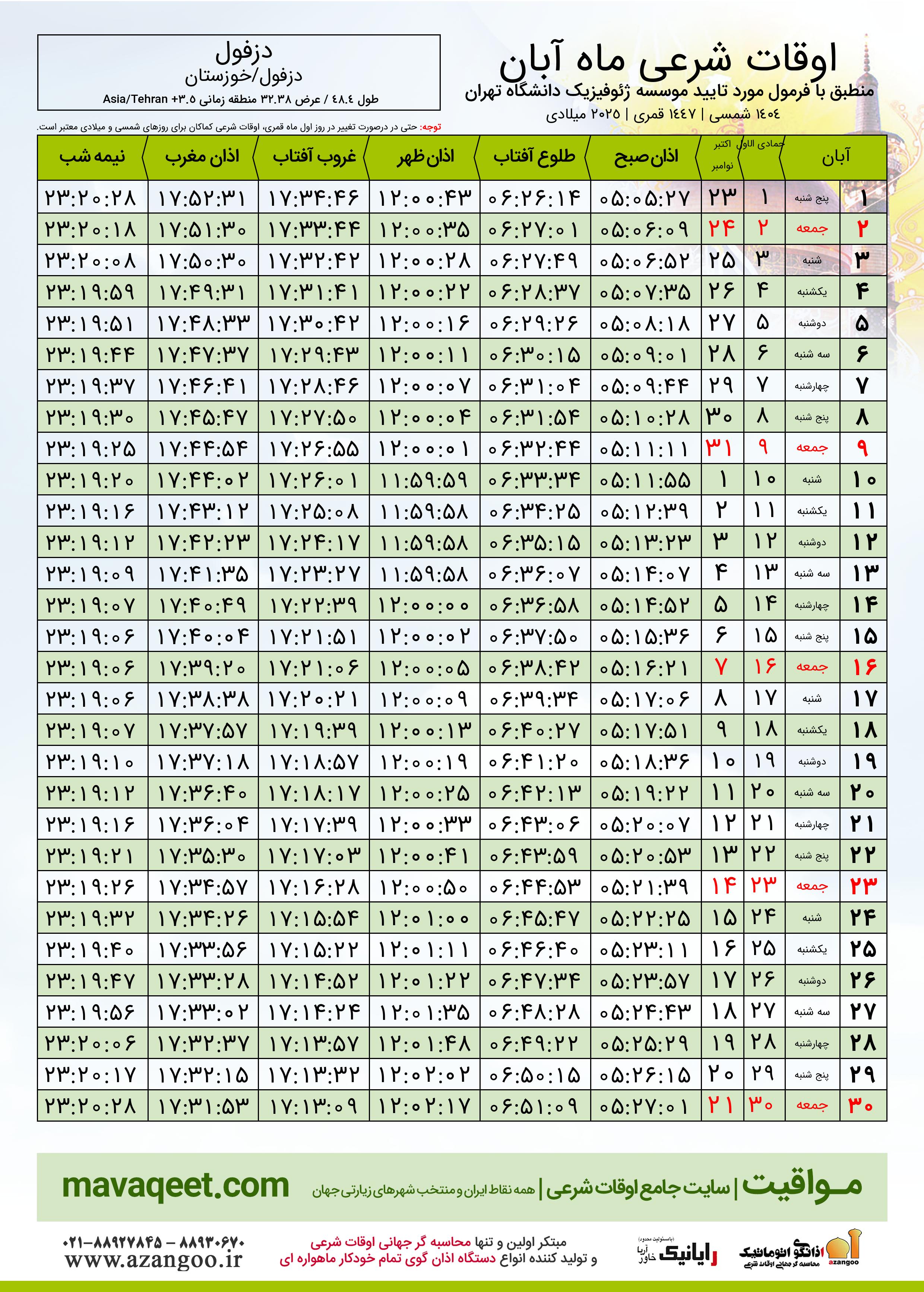 جدول اوقات شرعی آبان ١٤٠٤ شمسی شهر دزفول