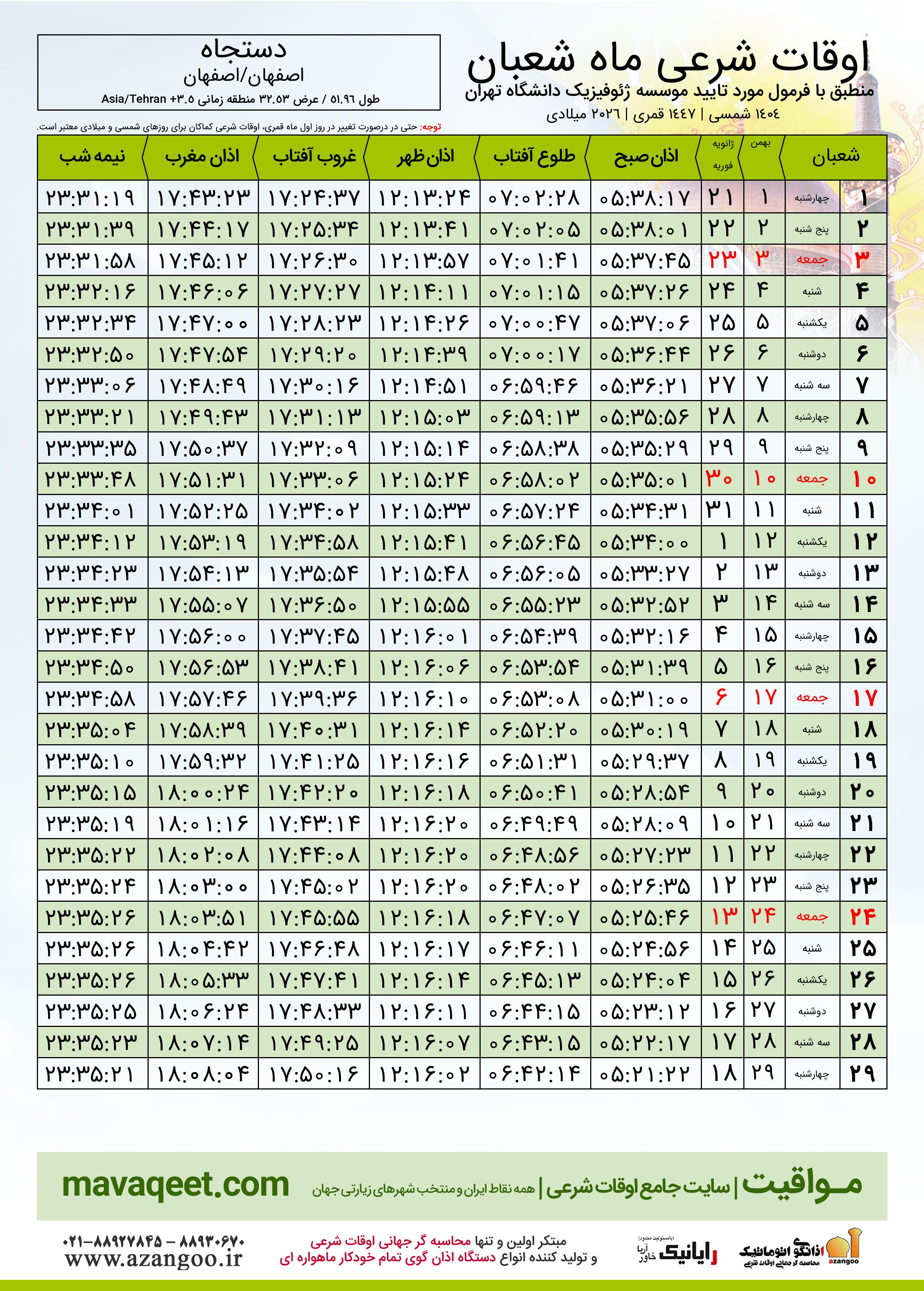 دانلود اوقات شرعی ماه شعبان ١٤٤٧ هـ.ق