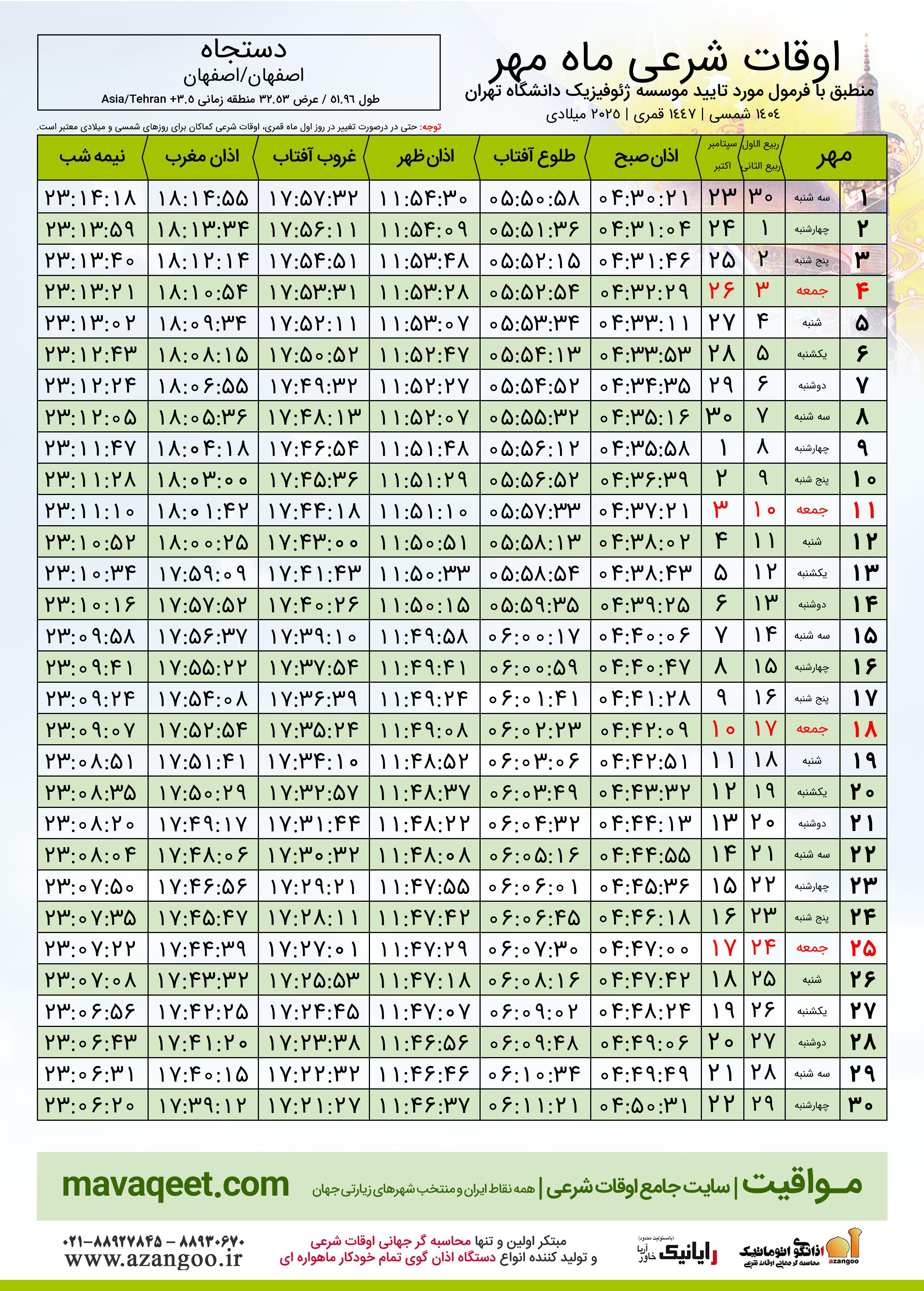 ٠٤ مهر ١٤٠٤ | ٠٤:٣٢:٢٩ | ٠٥:٥٢:٥٤ | ١١:٥٣:٢٨ | ١٧:٥٣:٣١ | ١٨:١٠:٥٤ | ٢٣:١٣:٢١ |