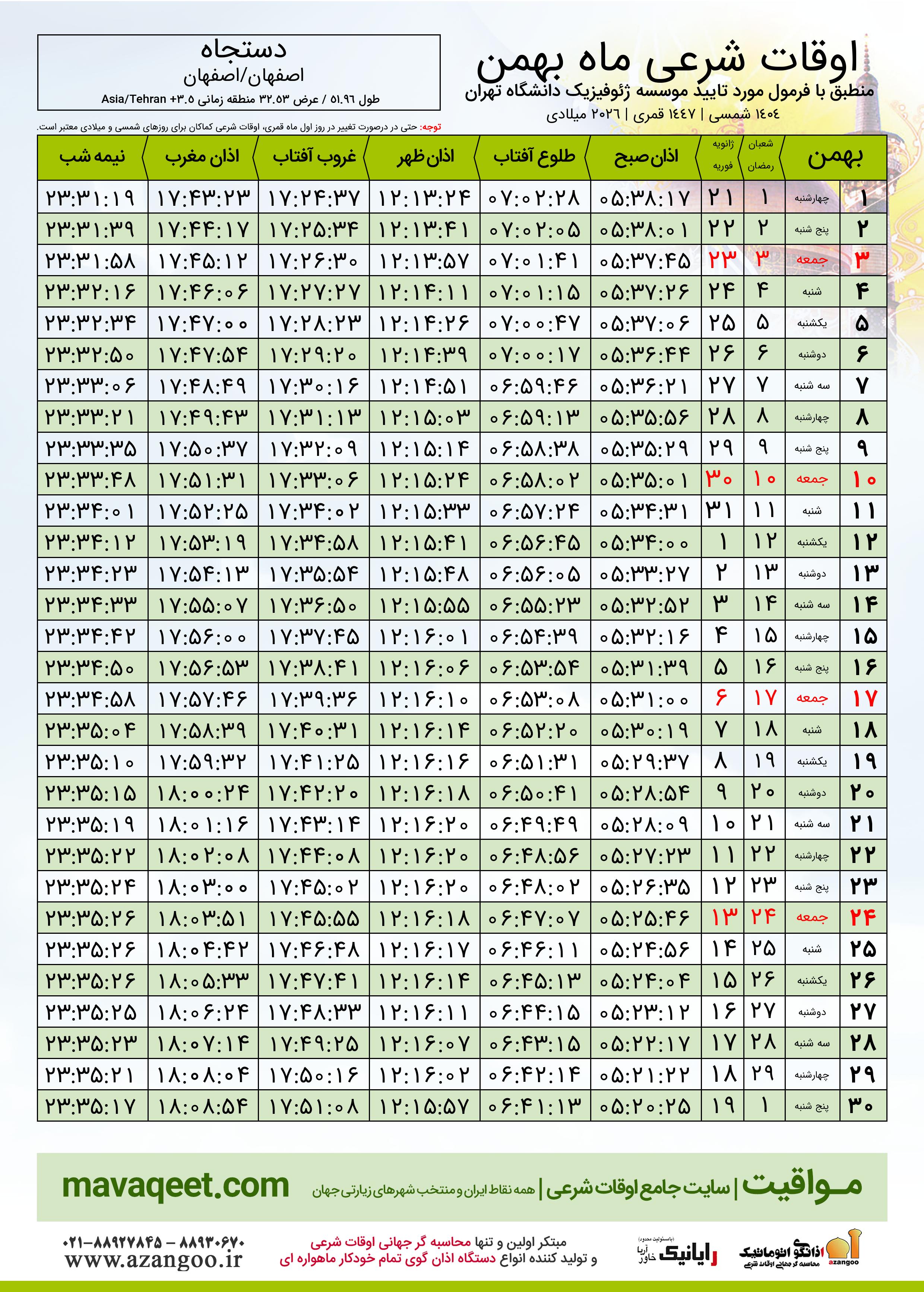 اوقات شرعی بهمن ٠٤ | اوقات شرعی فوریه ٢٦ | اوقات شرعی شعبان ١٤٤٧ | + اوقات شرعی رمضان ٤