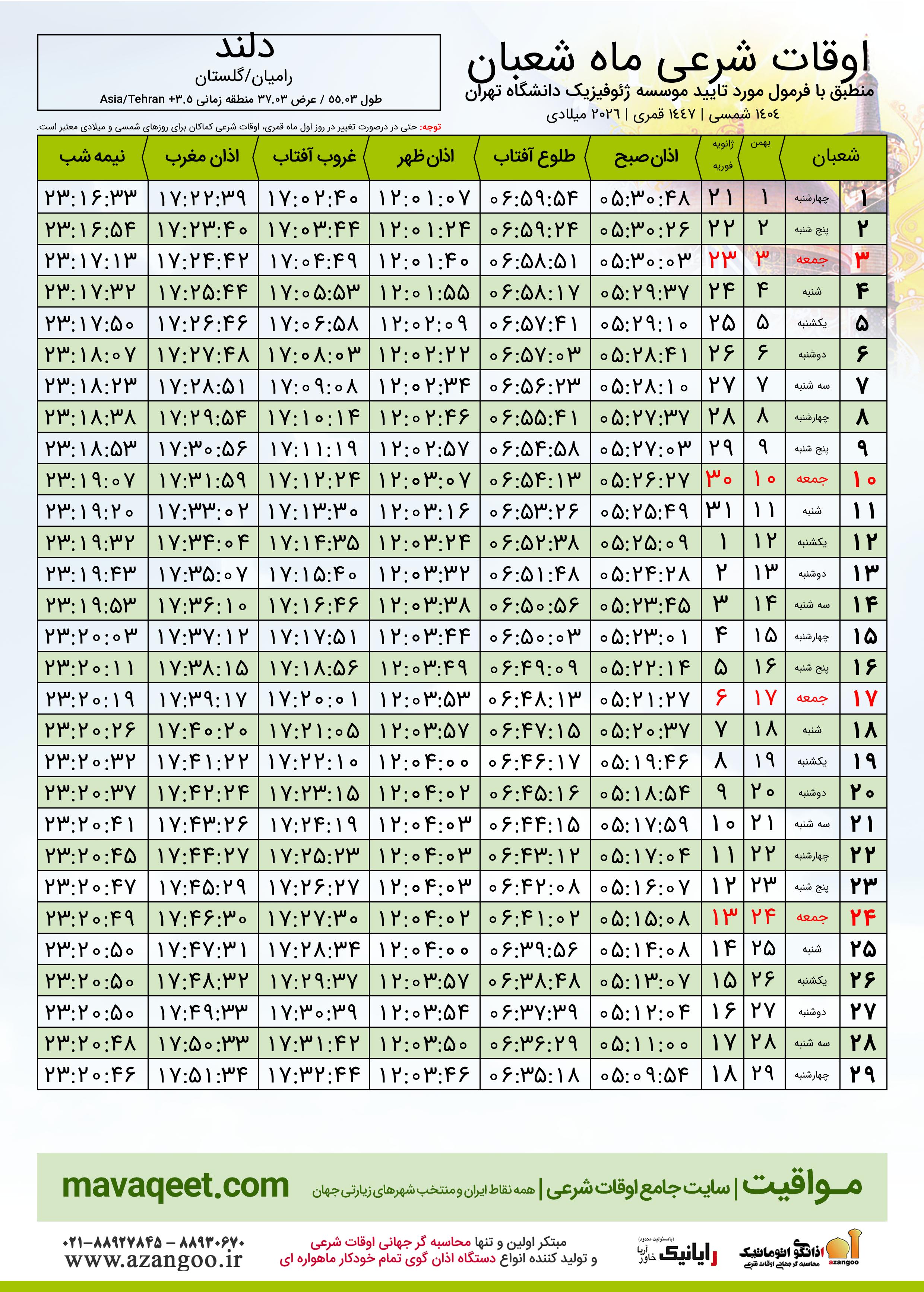 اوقات شرعی شعبان ١٤٤٧ قمری شهر دلند