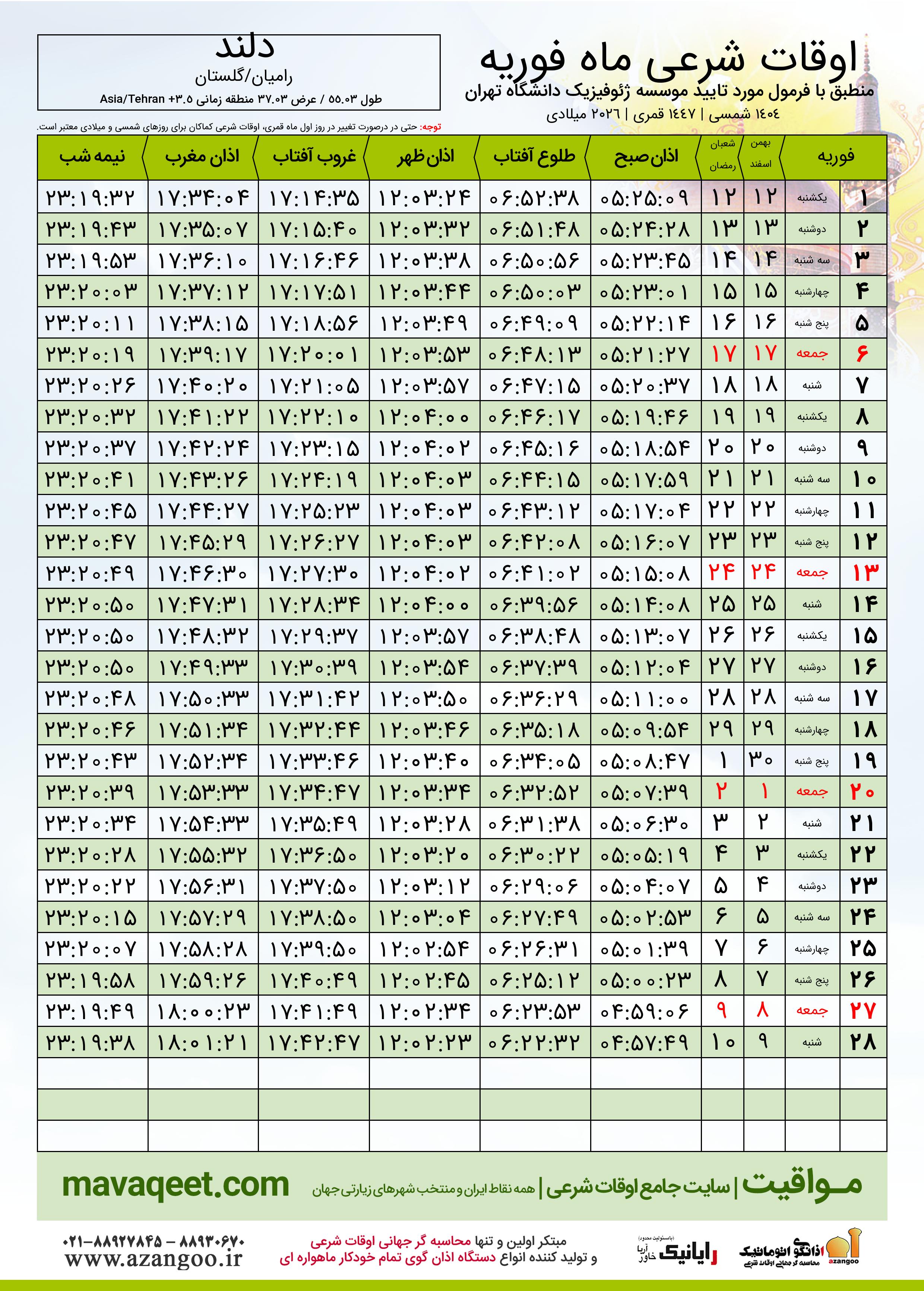 جدول اوقات شرعی ماه رمضان شهر دلند ٠٤ - ١٤٠٤ شمسی | ٢٠٢٦ میلادی | ١٤٤٧ قمری