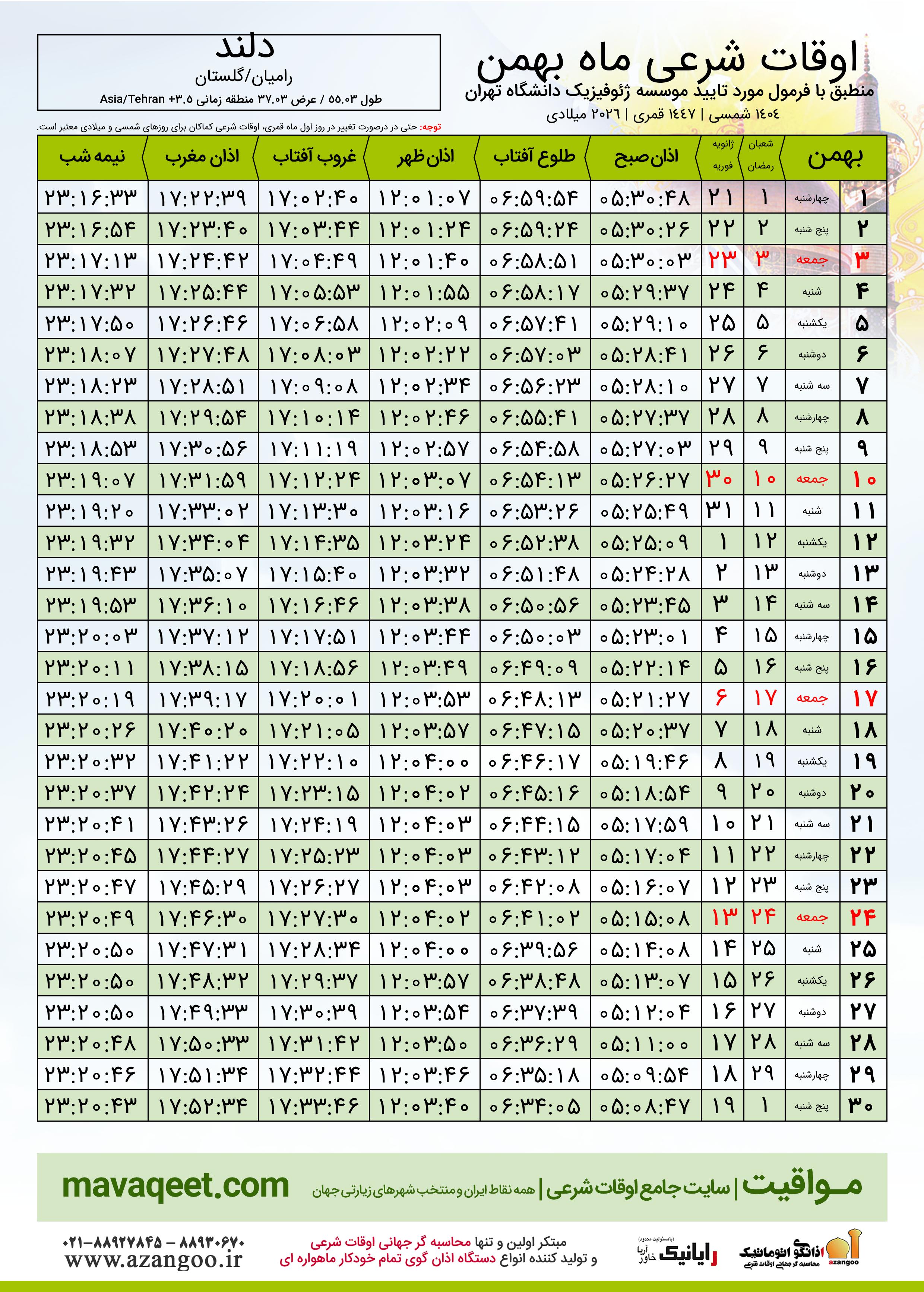 دانلود اوقات شرعی بهمن ٠٤ - ١٤٠٤ شهر دلند