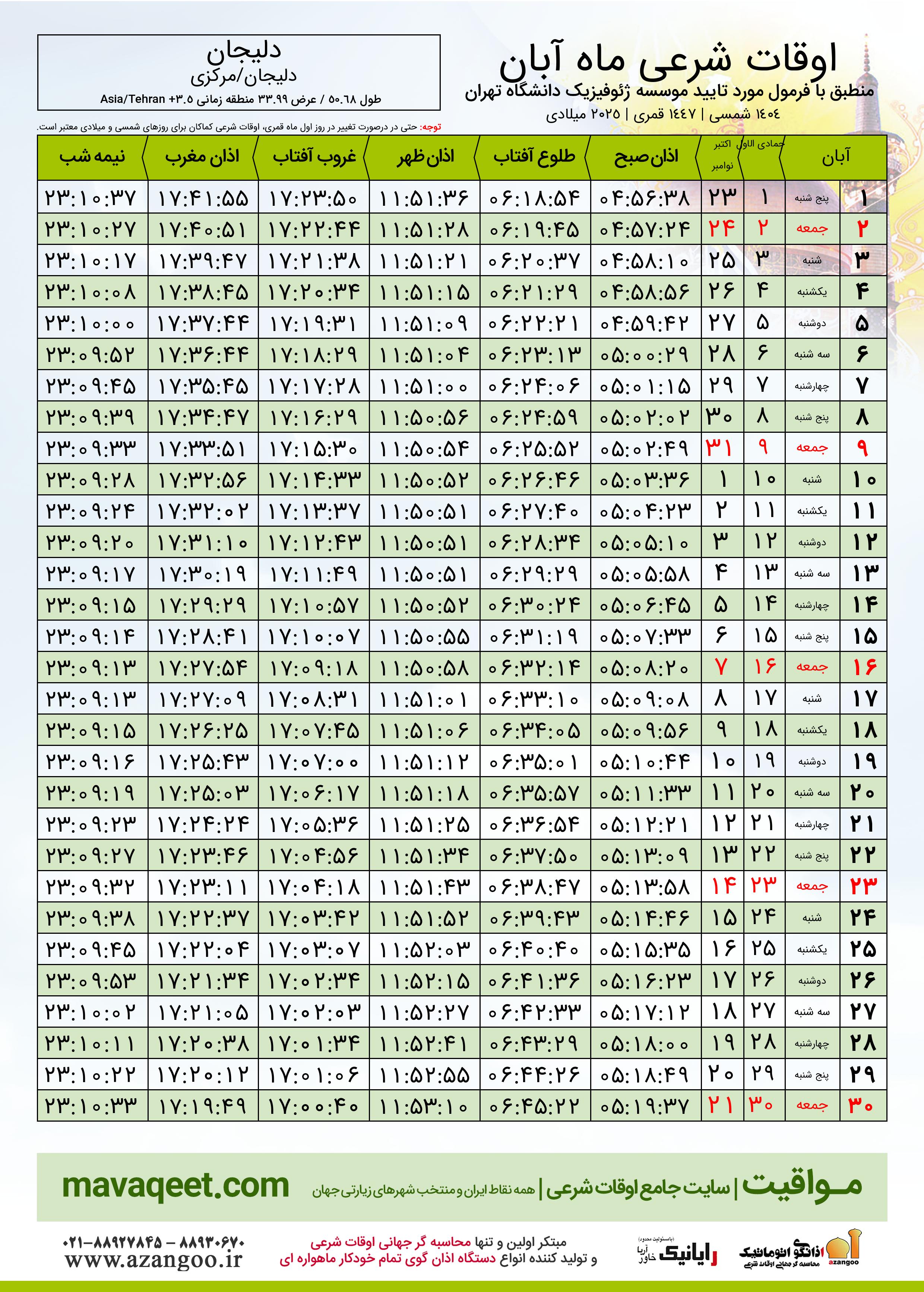 جدول اوقات شرعی آبان ١٤٠٤ شمسی شهر دلیجان