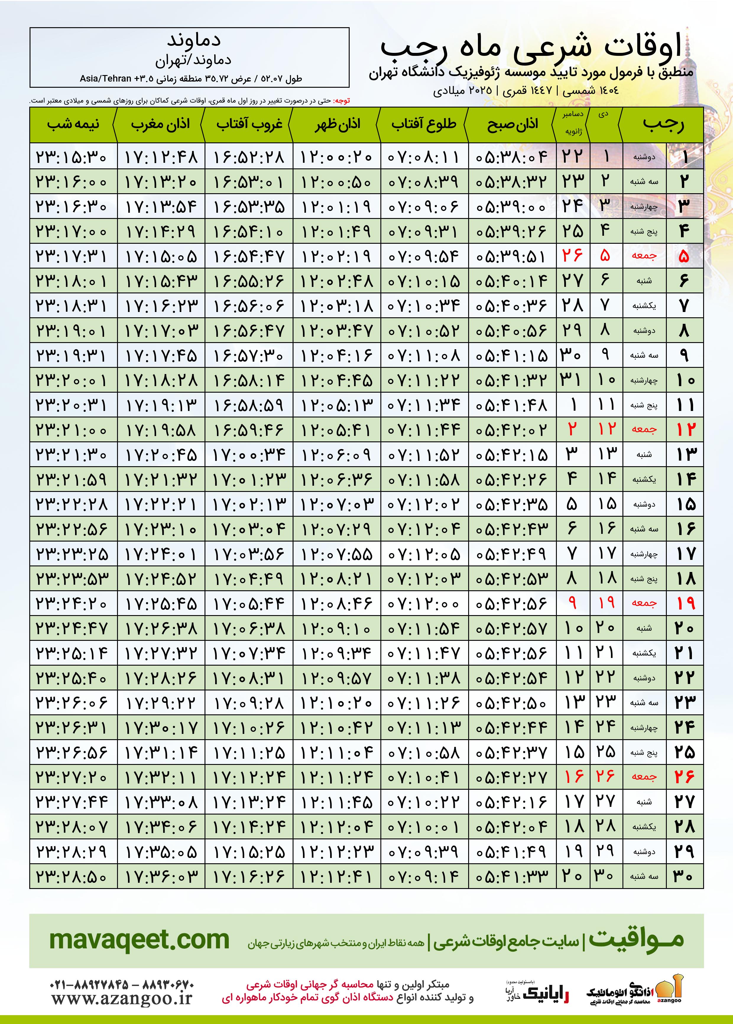 اوقات شرعی ماه رجب ١٤٤٧ هـ.ق شهر دماوند بر