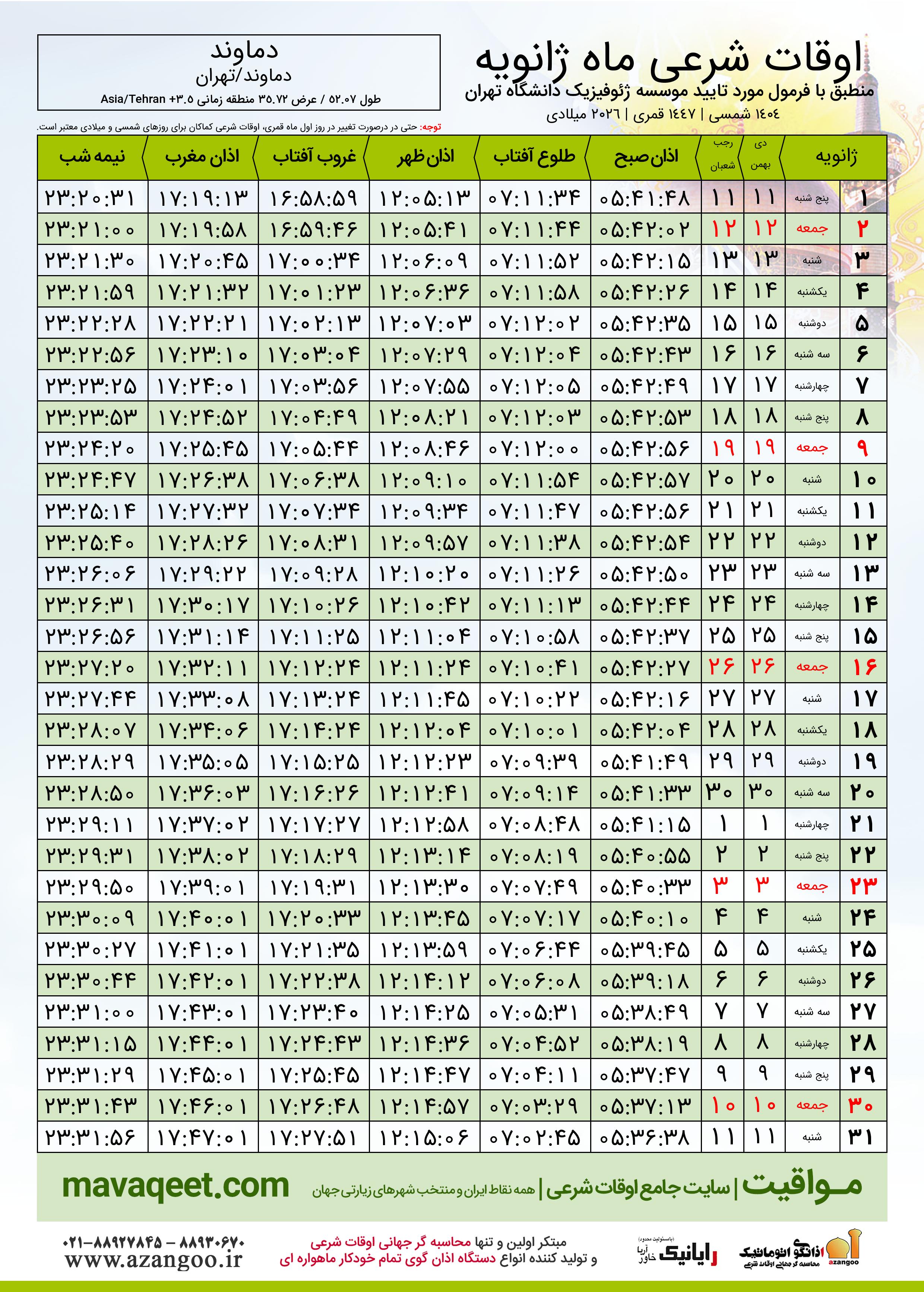 دانلود اوقات شرعی ماه رمضان ٠٤ - ١٤٠٤ شمسی | ٢٠٢٦ میلادی | ١٤٤٧ قمری شهر دماوند