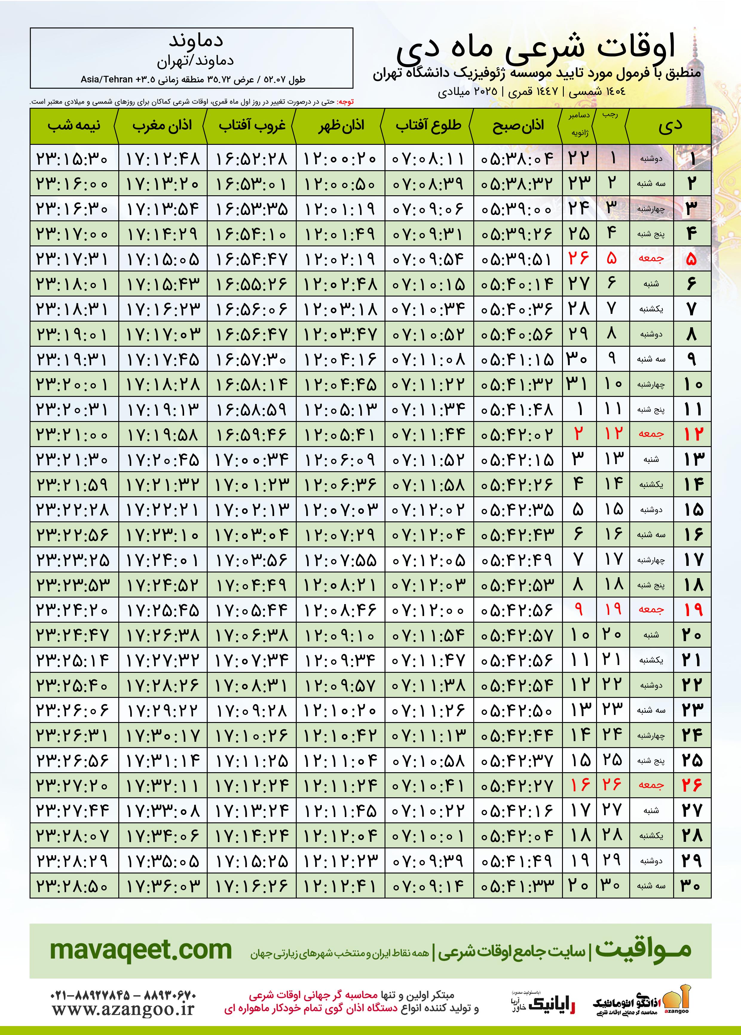 اوقات شرعی دی ١٤٠٤ شمسی شهر دماوند