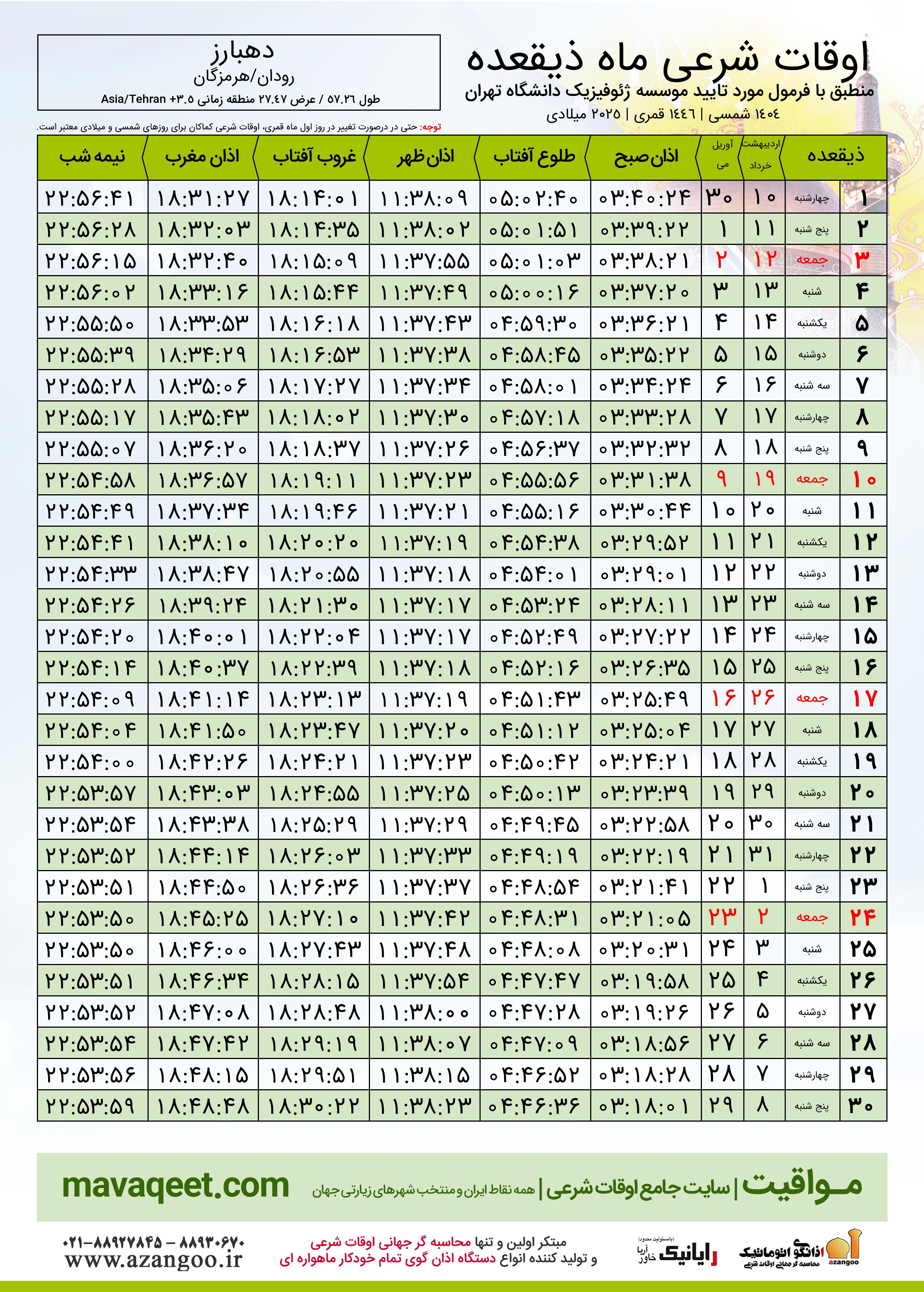 جهت نمایش تصویر جدول اوقات شرعی جدول اوقات شرعی دسامبر ٢٠٢٥ میلادی شهر دهبارز شهر دهبارز در اندازه