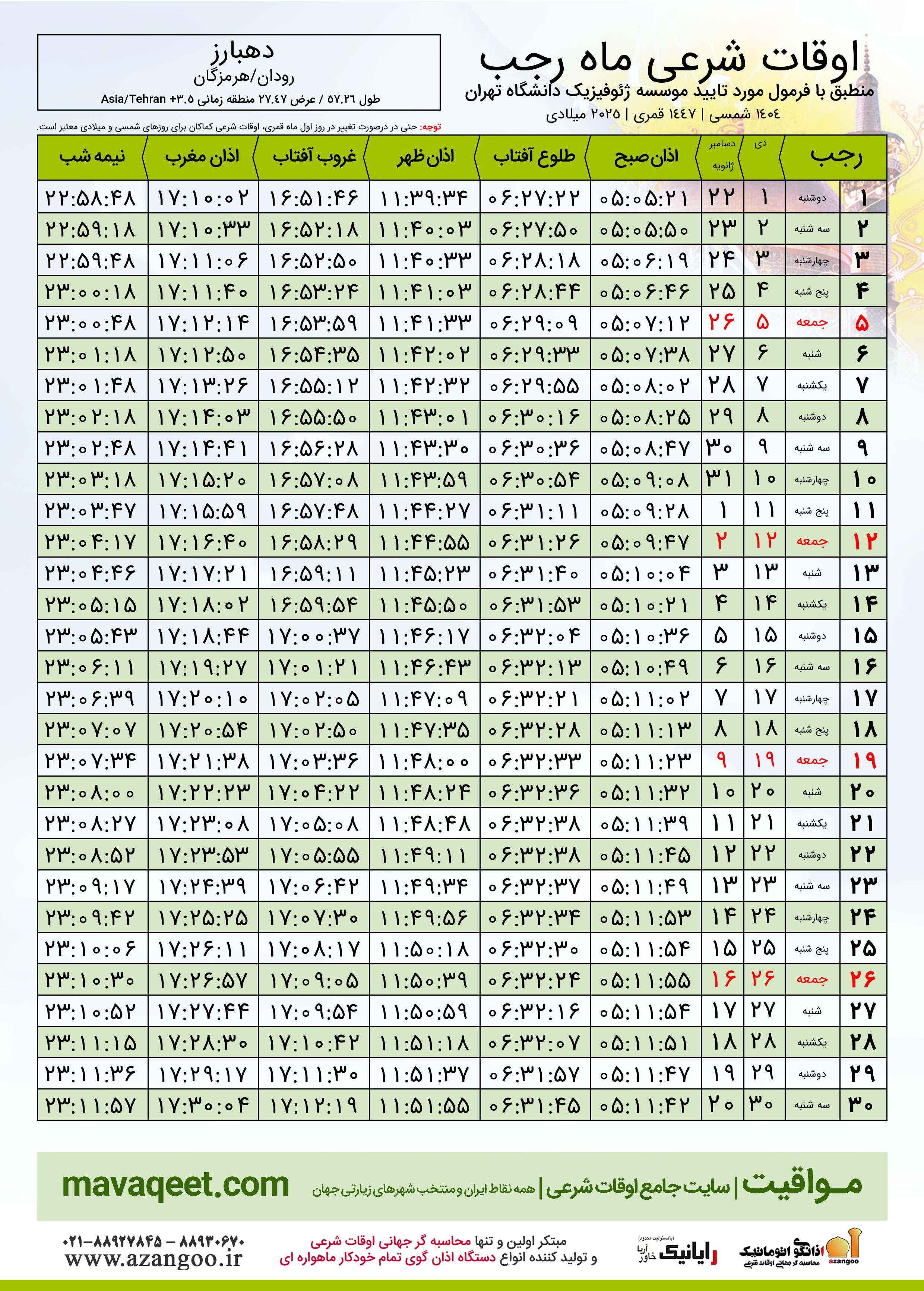 اوقات شرعی ماه رجب ١٤٤٧ هـ.ق شهر دهبارز بر