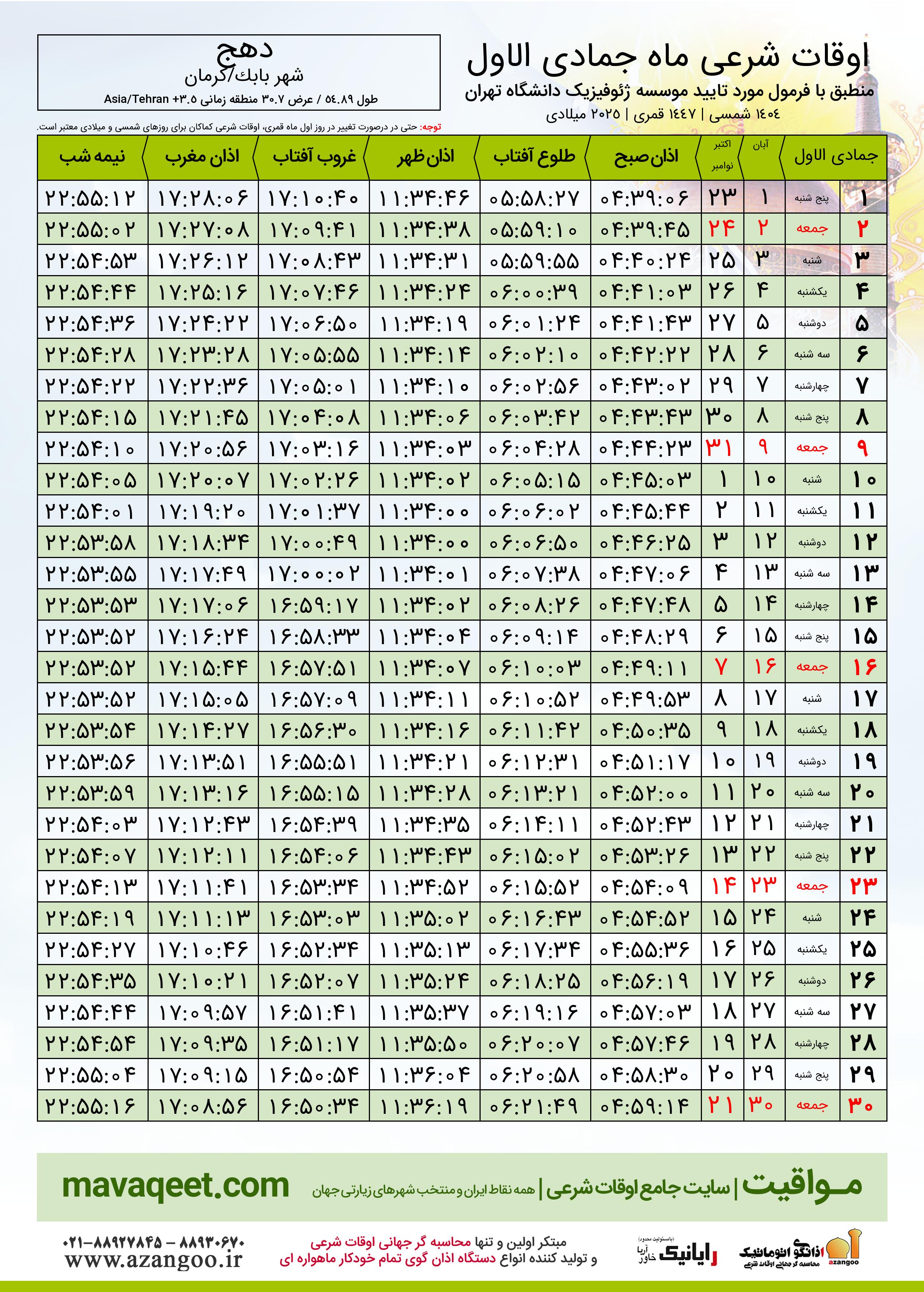 اوقات شرعی ماه جمادی الاول ١٤٤٧ هـ.ق شهر دهج بر