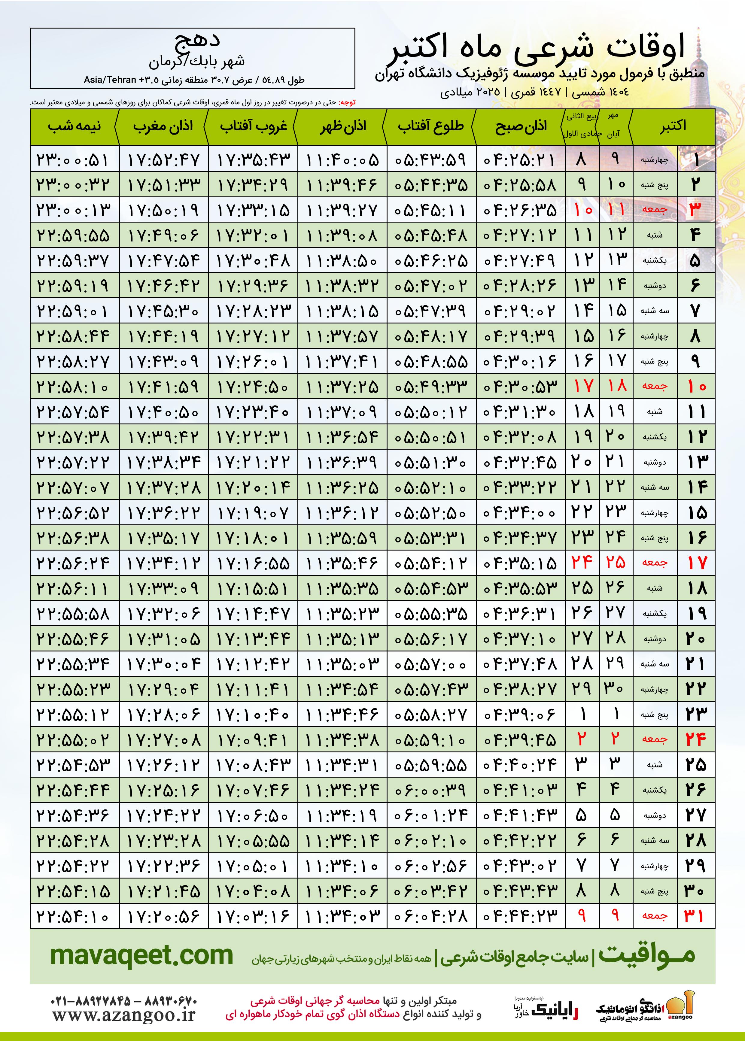 جدول اوقات شرعی اکتبر ٢٠٢٥ میلادی شهر دهج