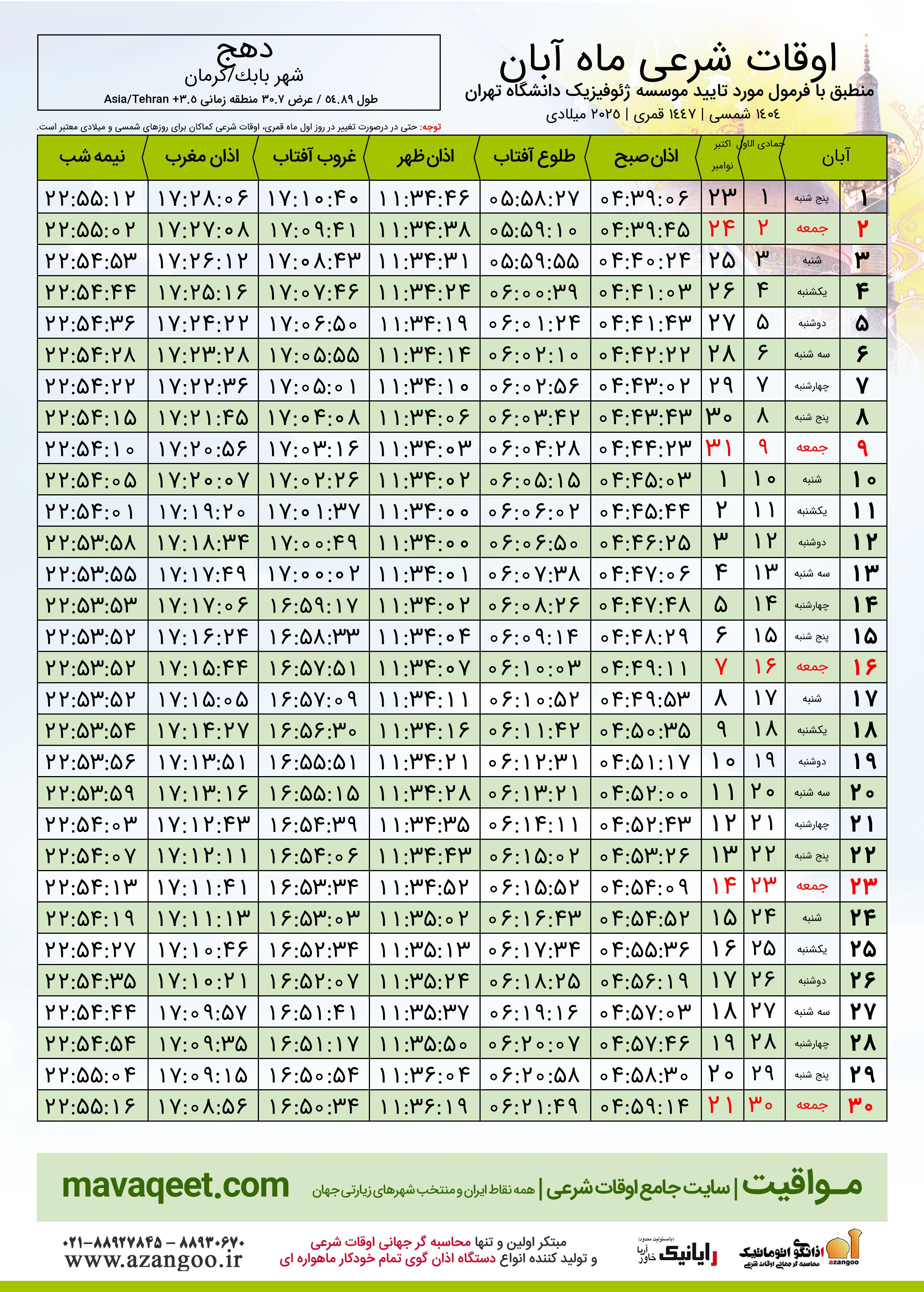 جدول اوقات شرعی آبان ١٤٠٤ شمسی شهر دهج