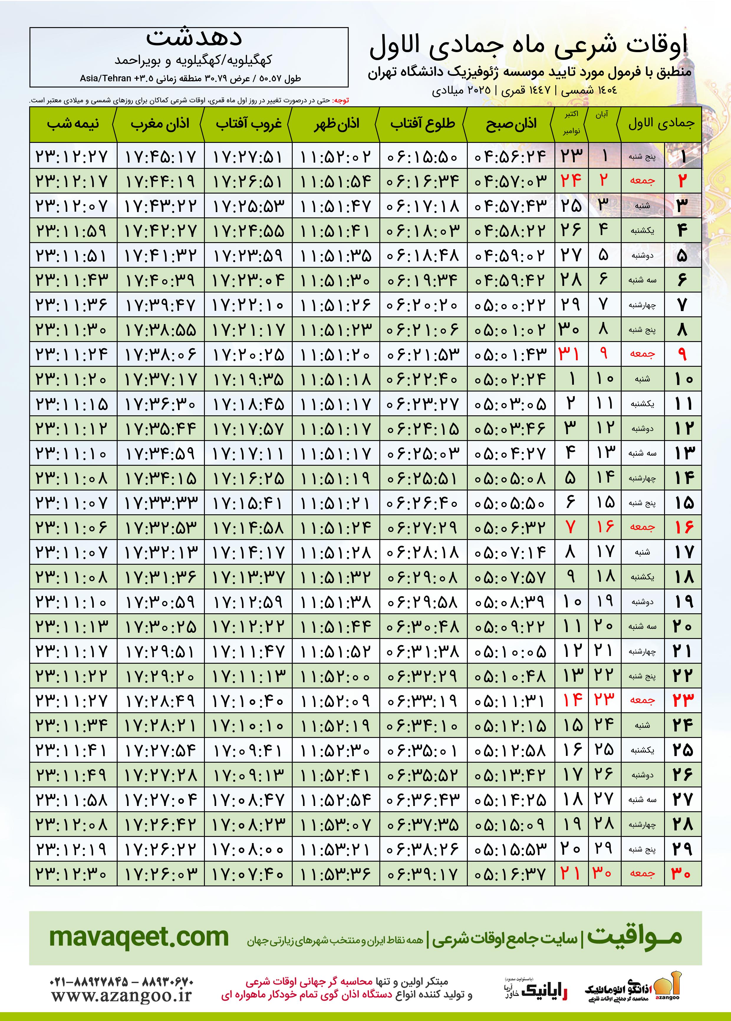 اوقات شرعی ماه جمادی الاول ١٤٤٧ هـ.ق شهر دهدشت بر