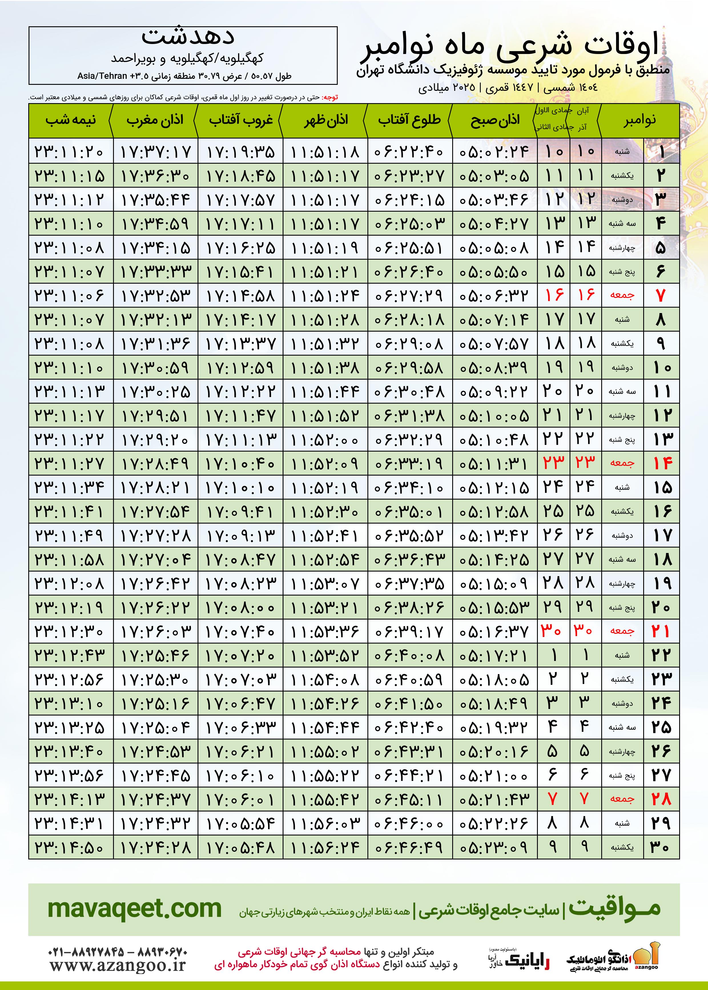 دانلود اوقات شرعی نوامبر ٢٠٢٥ شهر دهدشت