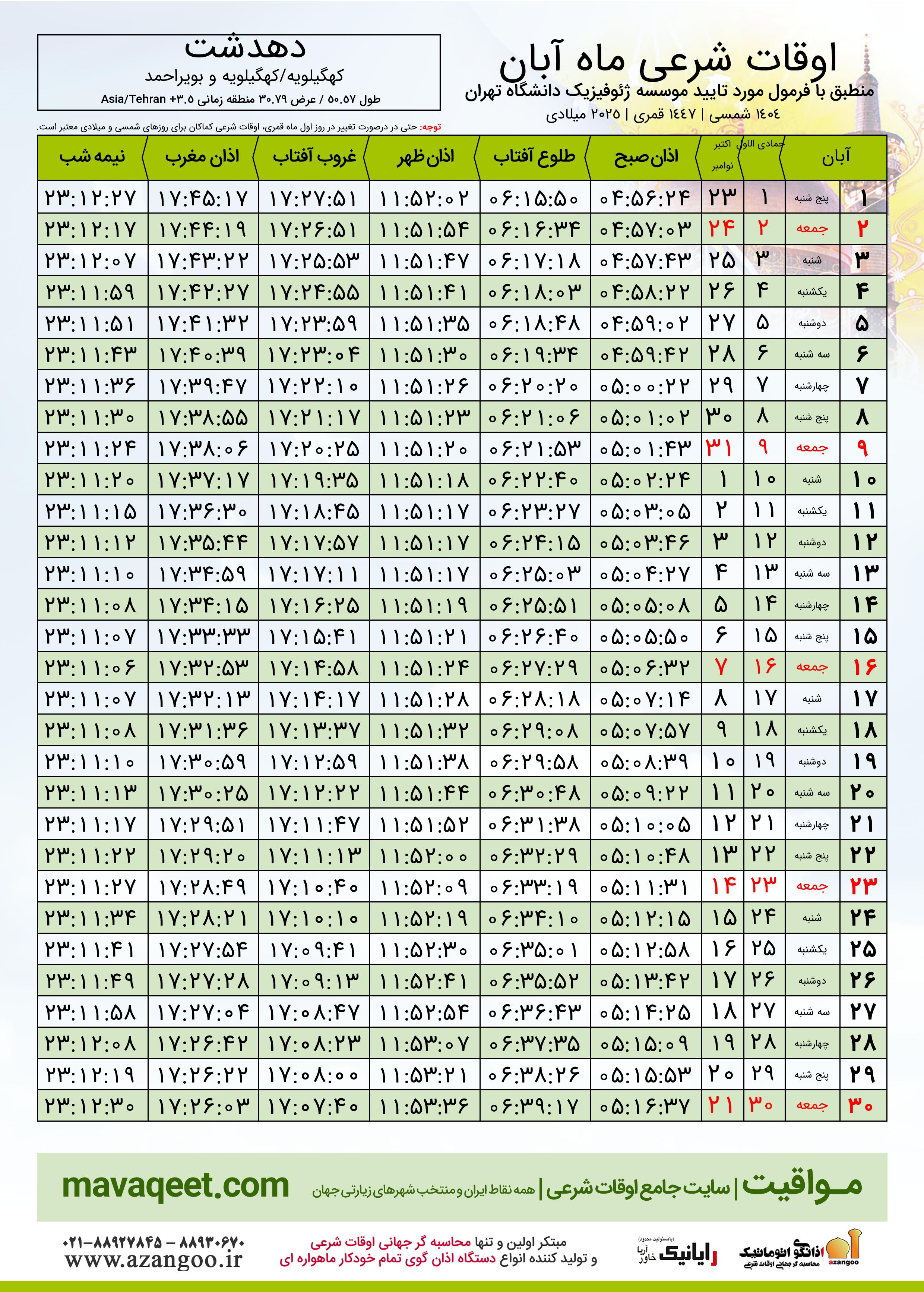 جدول اوقات شرعی آبان ١٤٠٤ شمسی شهر دهدشت