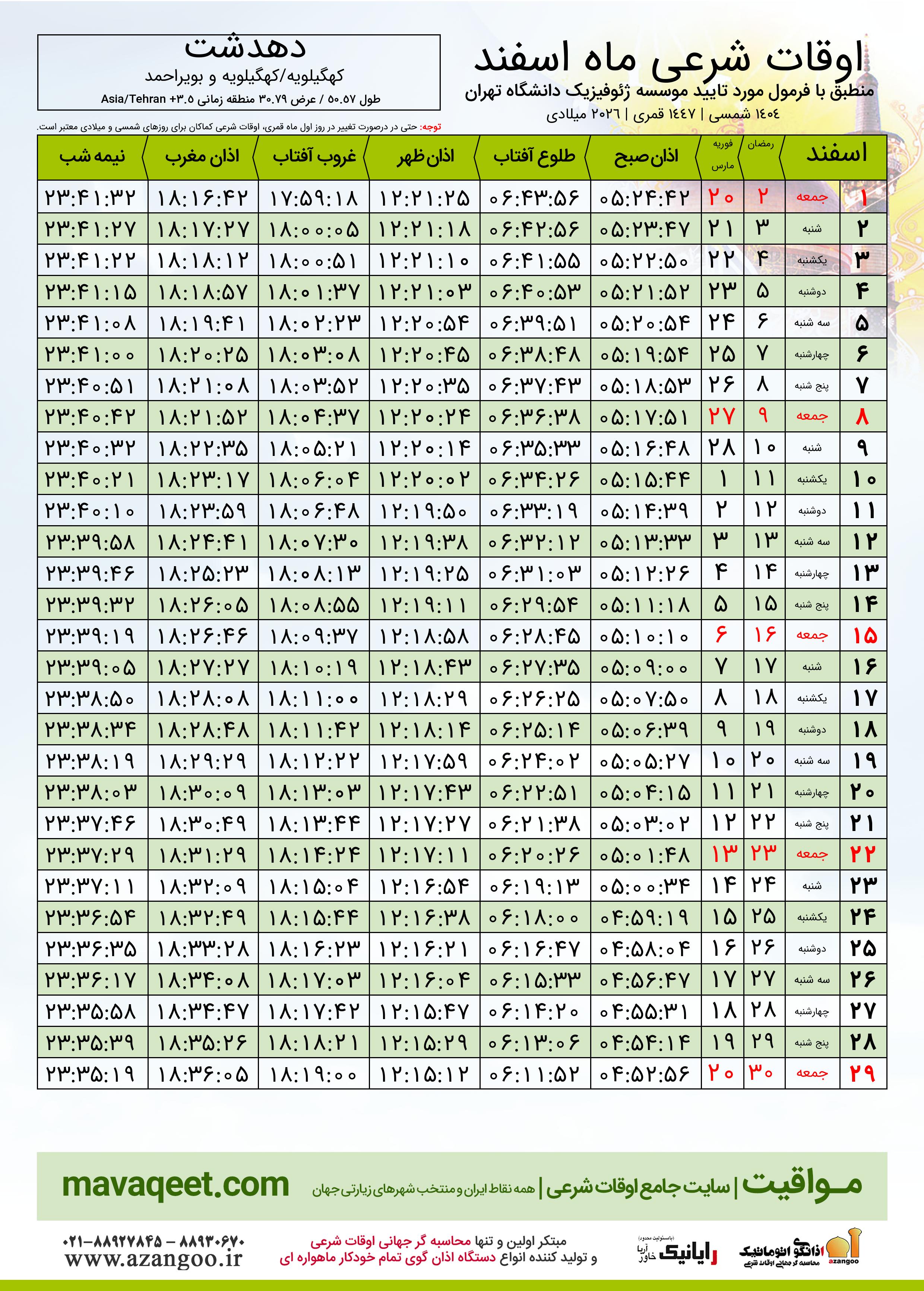 جدول اوقات شرعی اسفند ١٤٠٤ شمسی شهر دهدشت