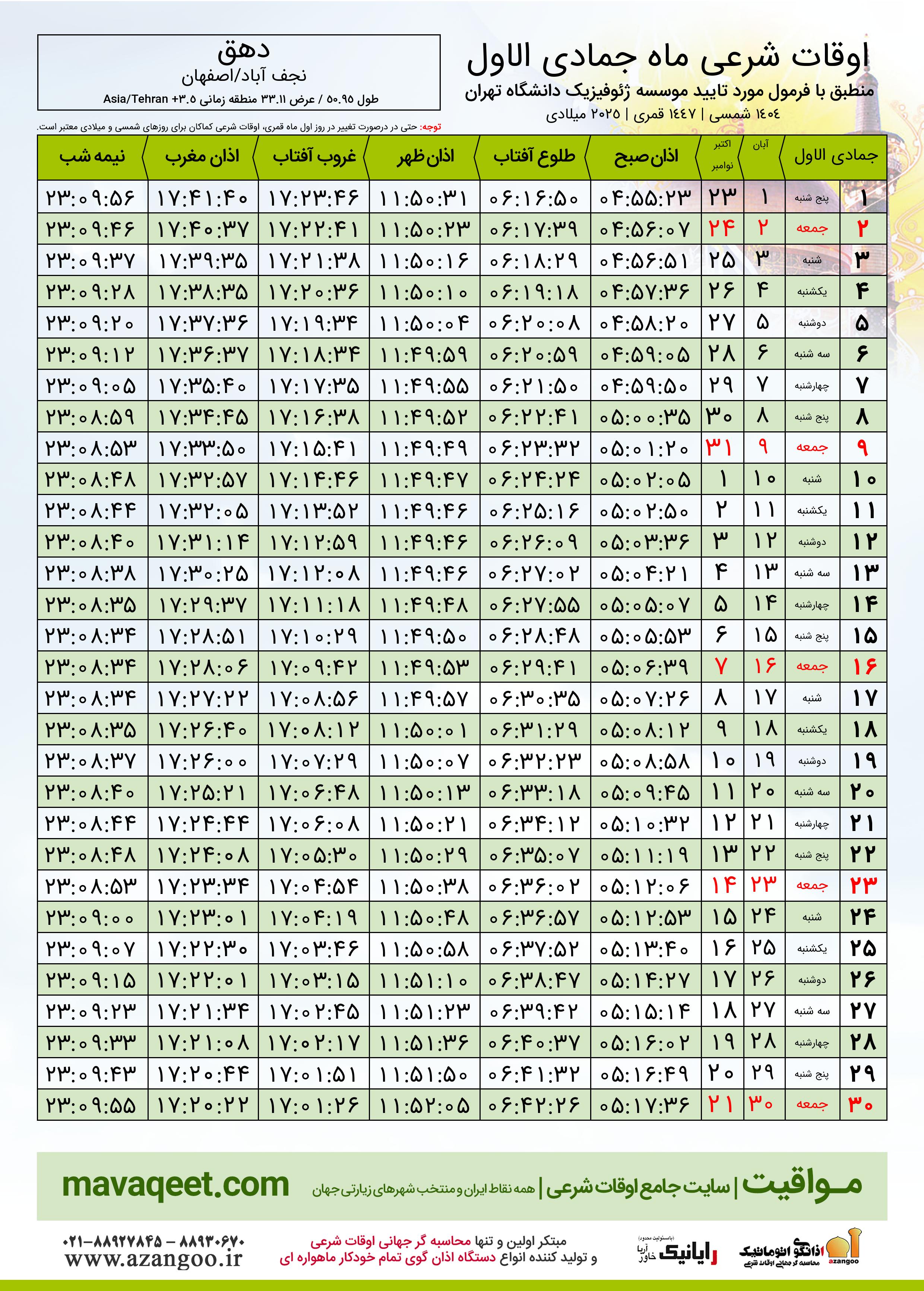 جدول اوقات شرعی جمادی الاول ١٤٤٧ قمری شهر دهق