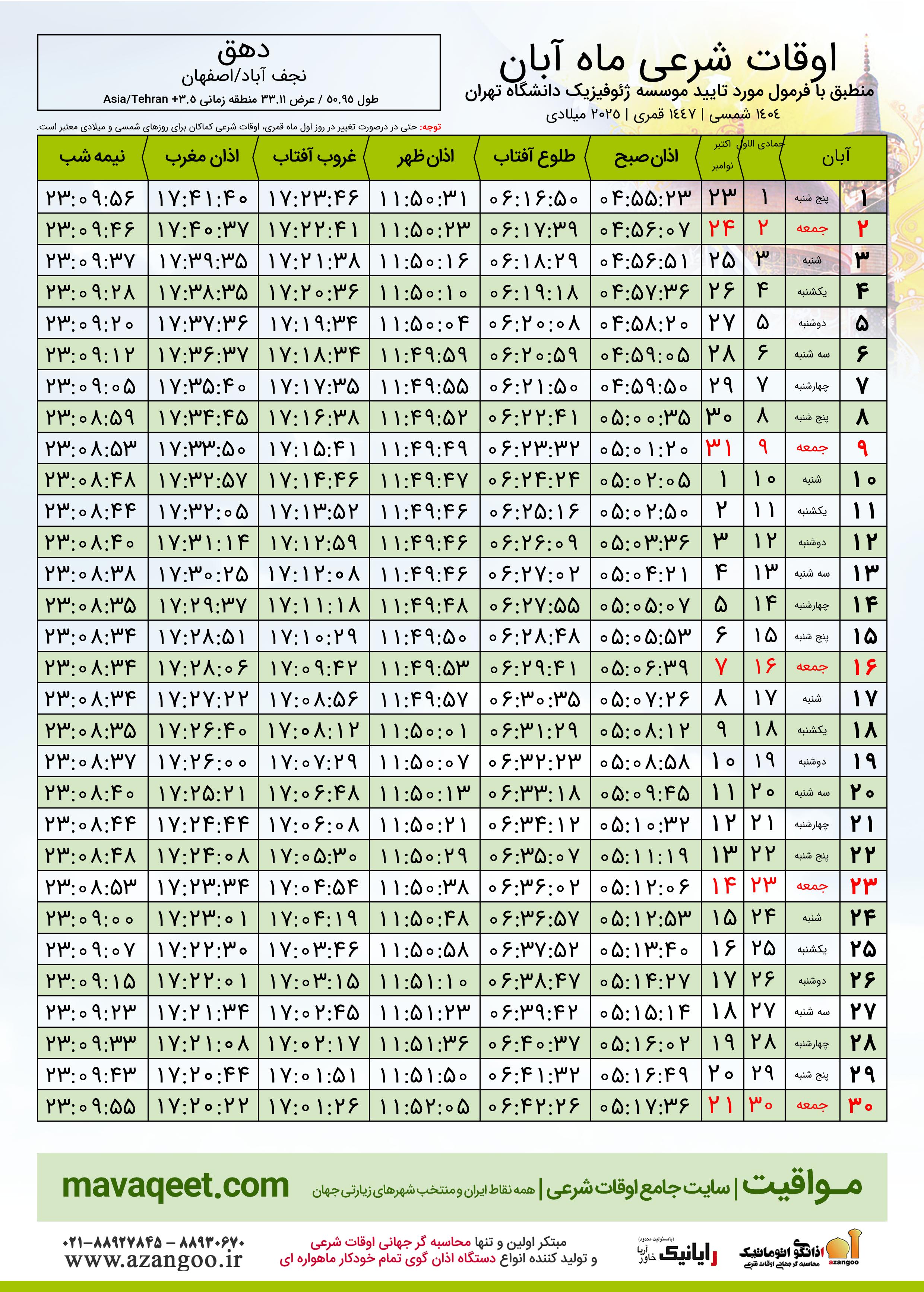 جدول اوقات شرعی آبان ١٤٠٤ شمسی شهر دهق