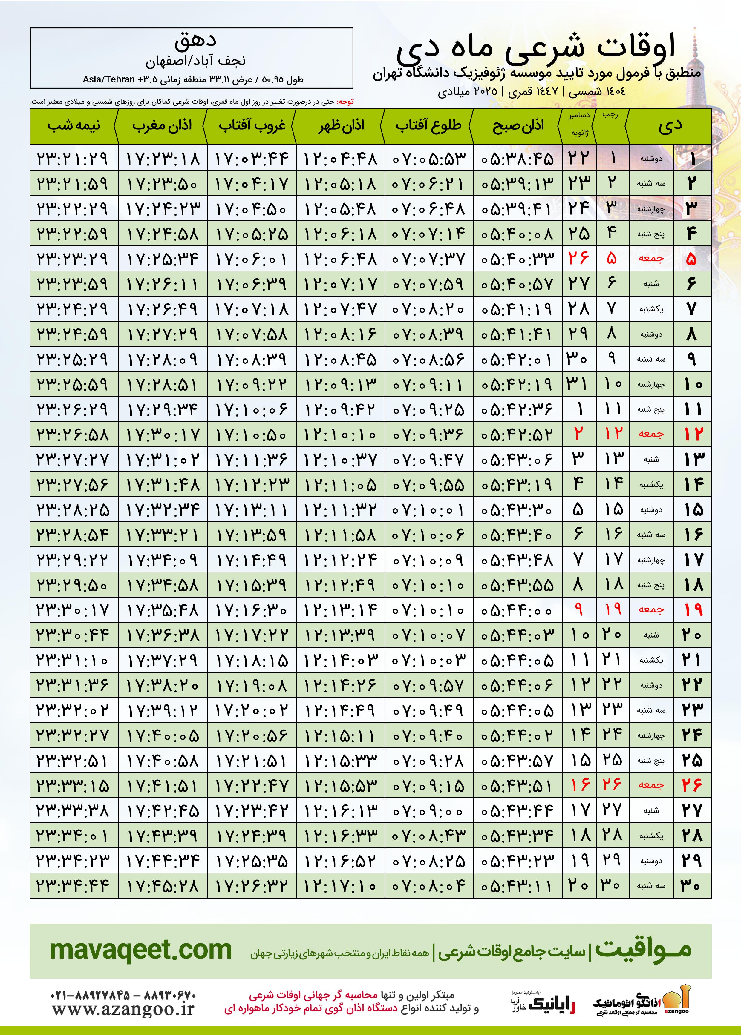 اوقات شرعی دی ١٤٠٤ شمسی شهر دهق