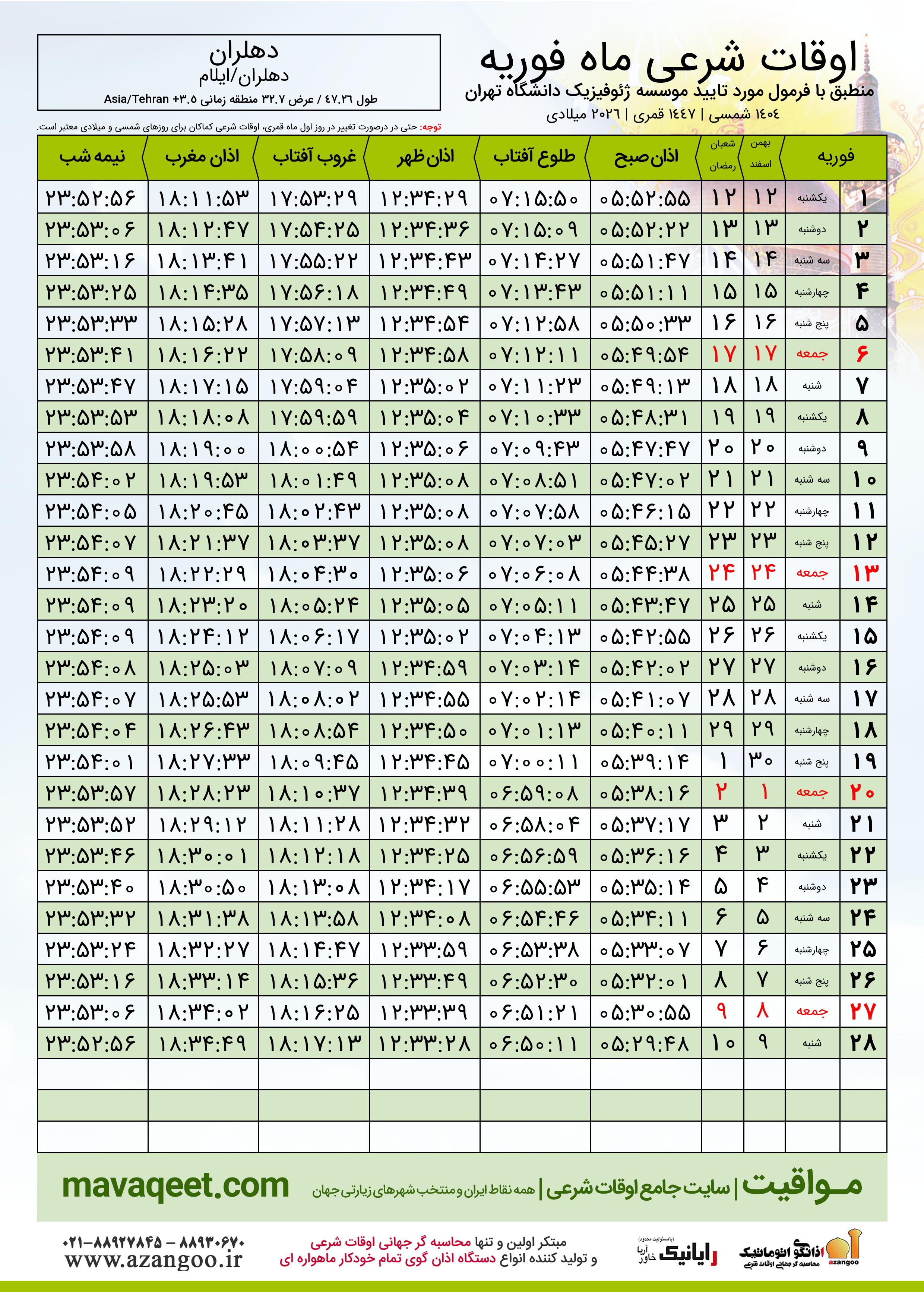 دانلود اوقات شرعی فوریه ٢٠٢٦ شهر دهلران