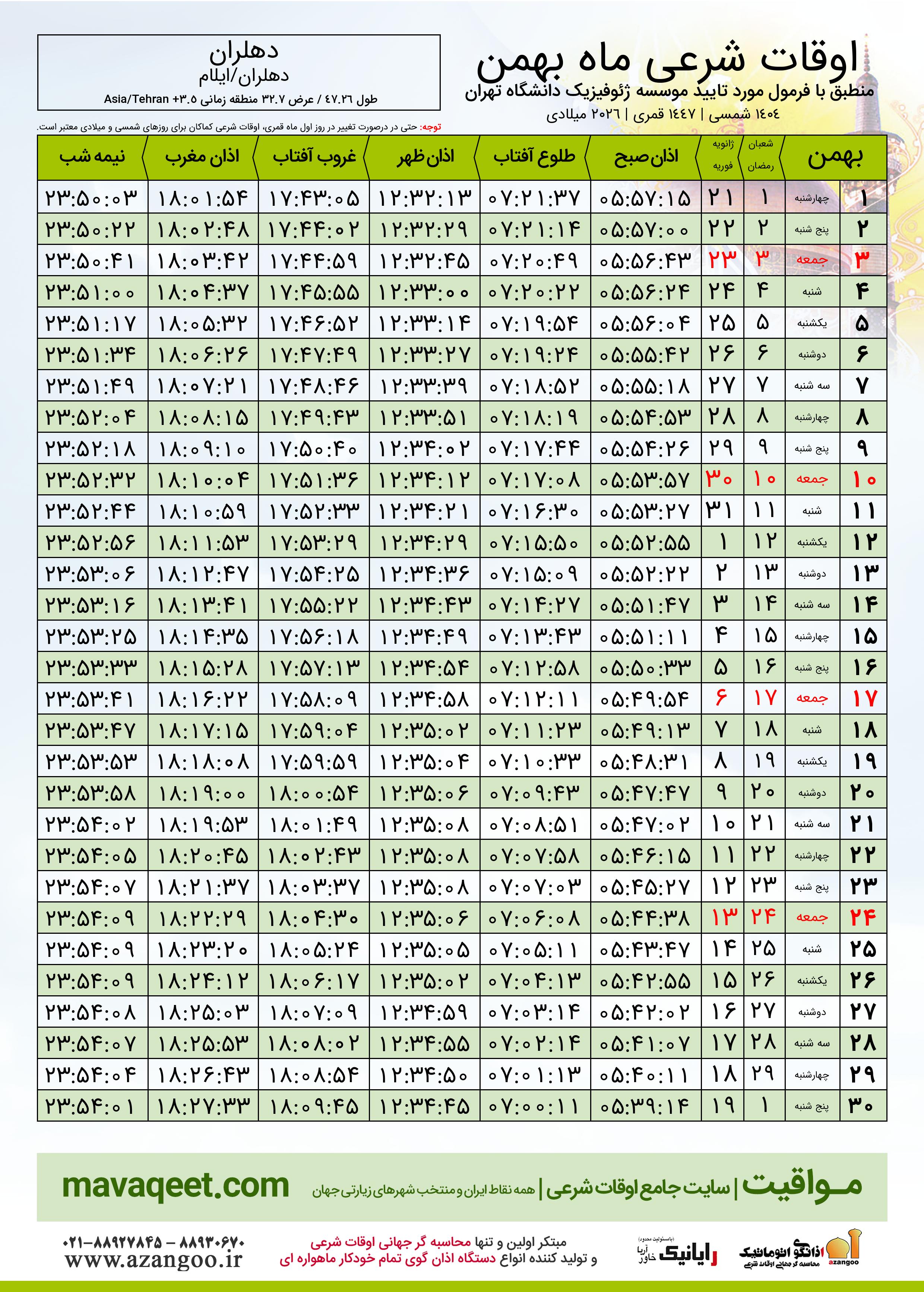 دانلود اوقات شرعی بهمن ٠٤ - ١٤٠٤ شهر دهلران