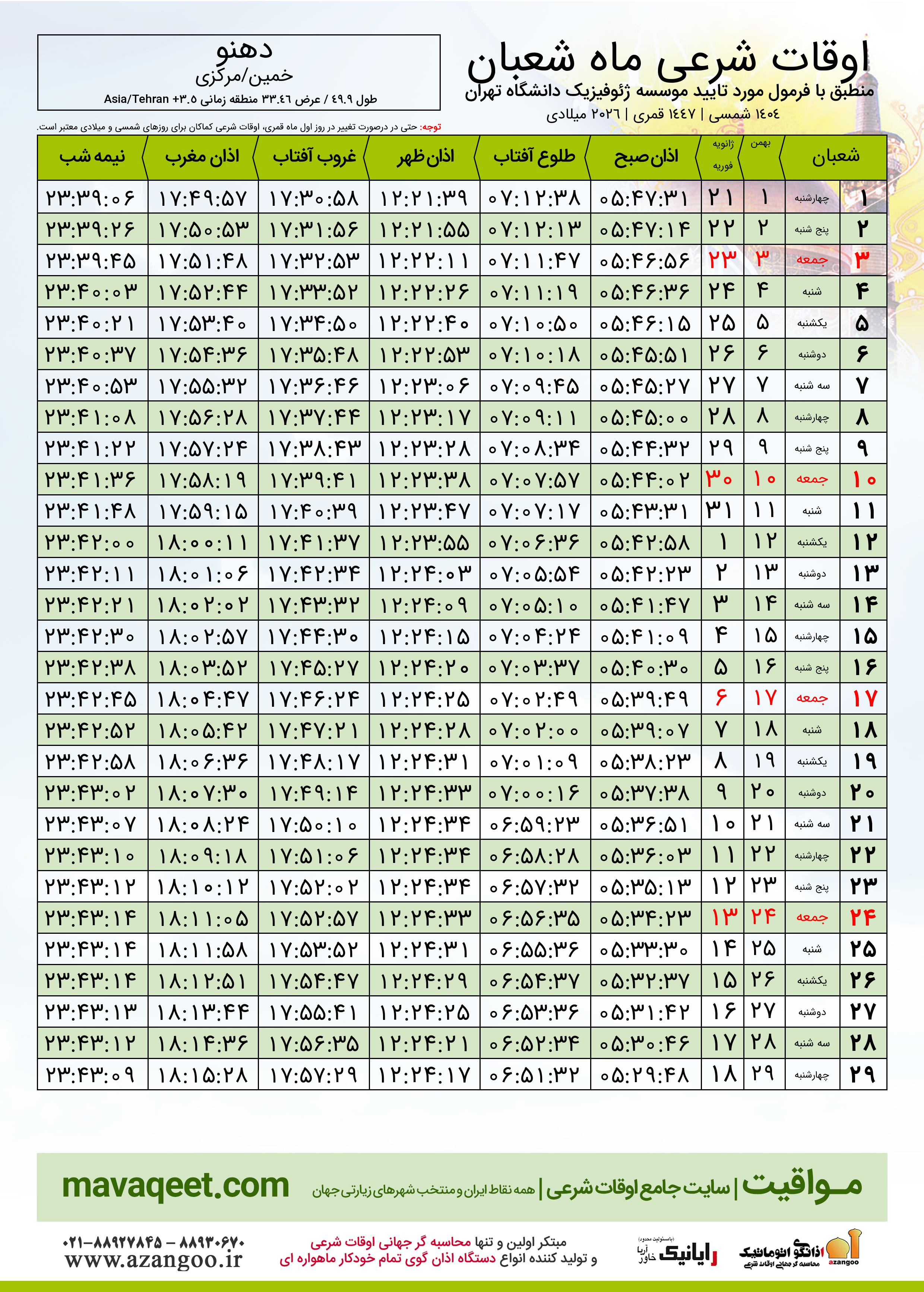 اوقات شرعی شعبان ١٤٤٧ قمری شهر دهنو