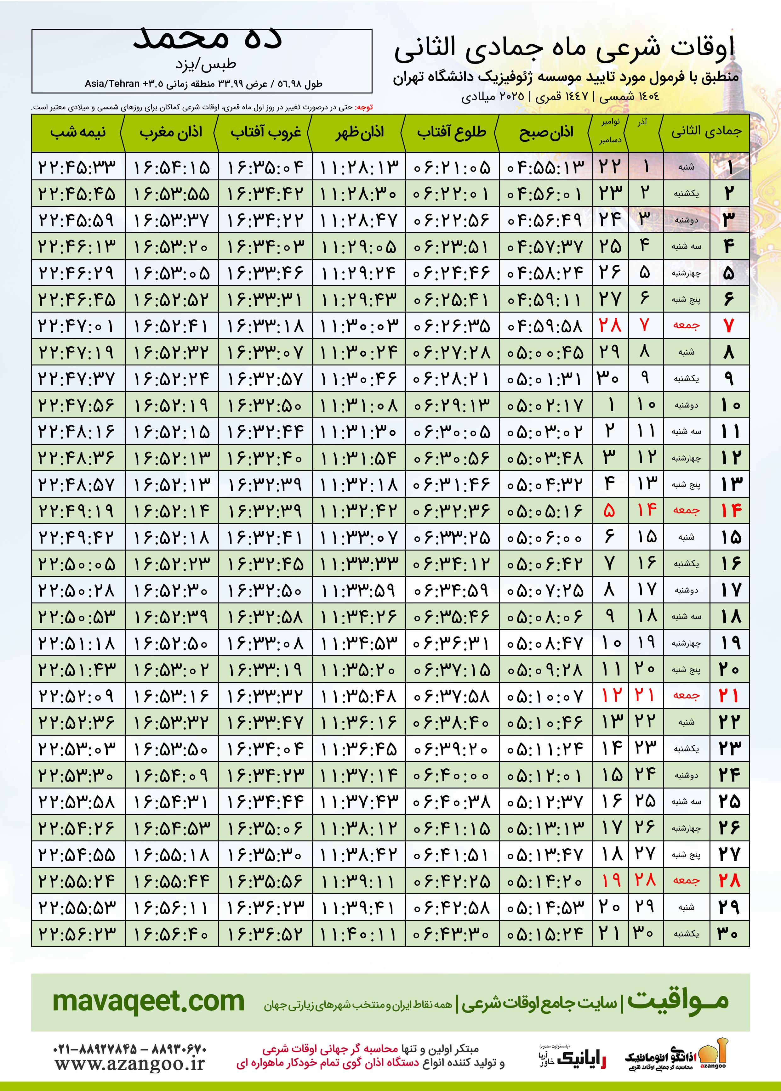 اوقات شرعی ماه جمادی الثانی ١٤٤٧ هـ.ق شهر ده محمد بر