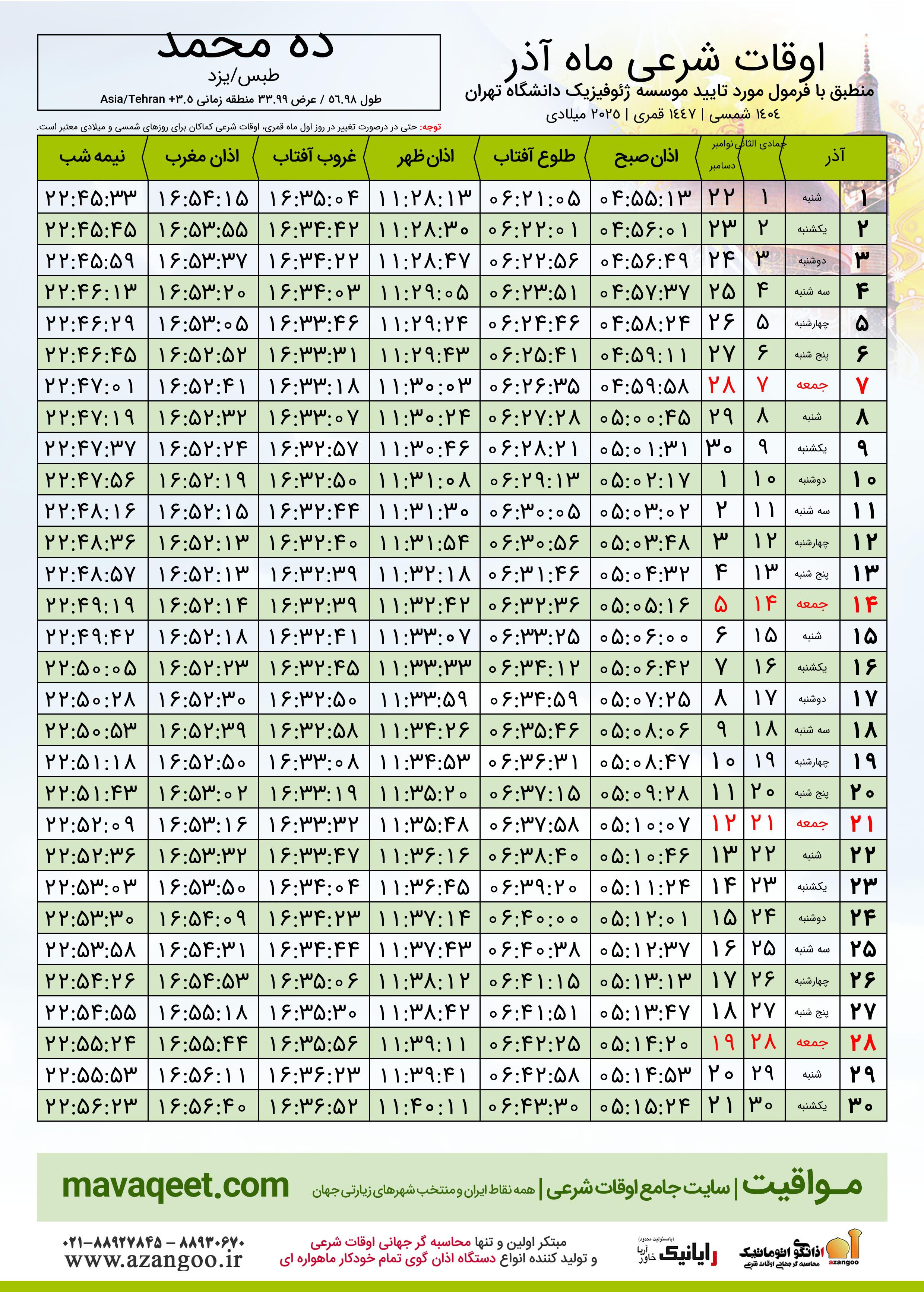 جدول اوقات شرعی آذر ١٤٠٤ شمسی شهر ده محمد