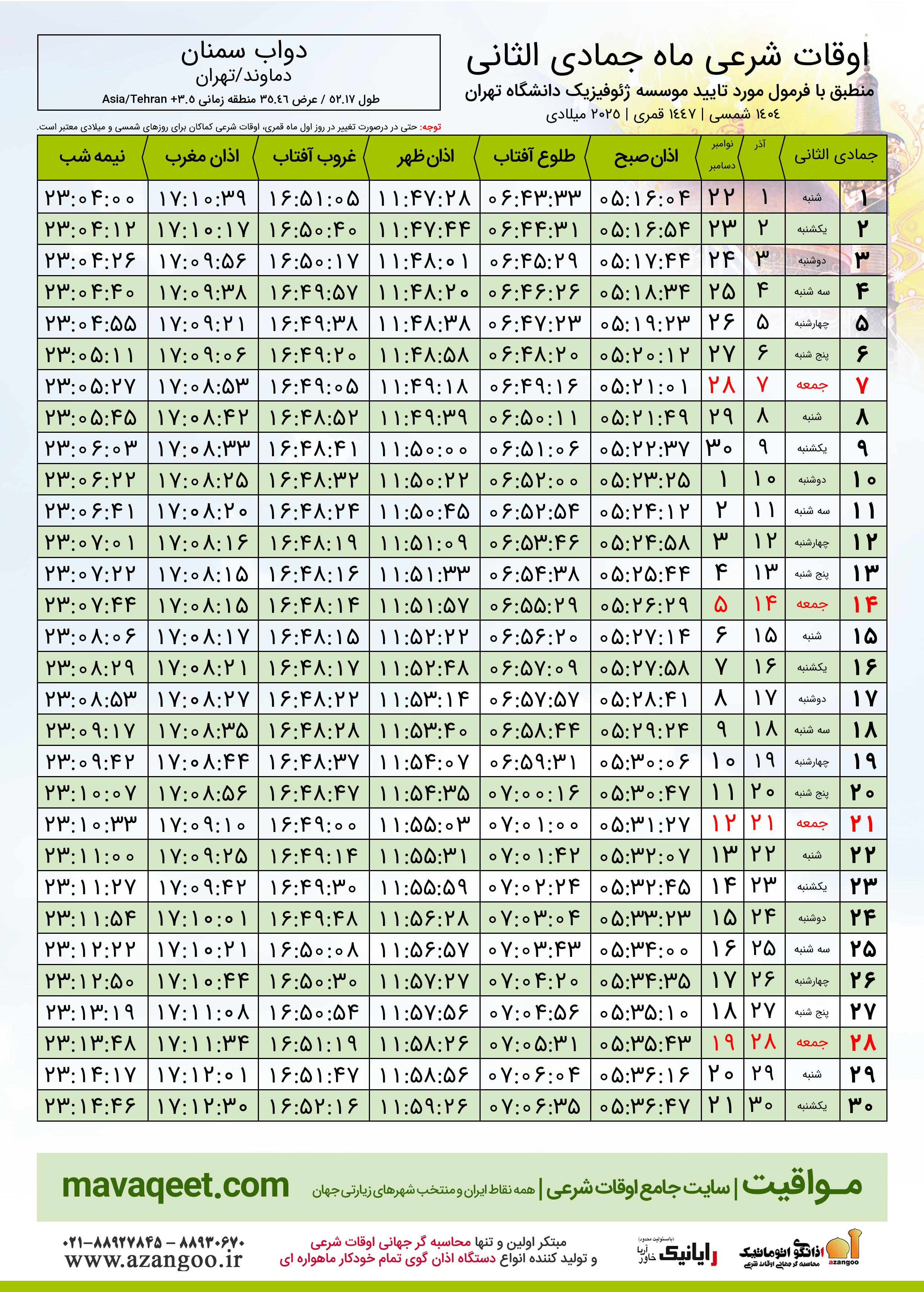 اوقات شرعی ماه جمادی الثانی ١٤٤٧ هـ.ق شهر دواب سمنان بر