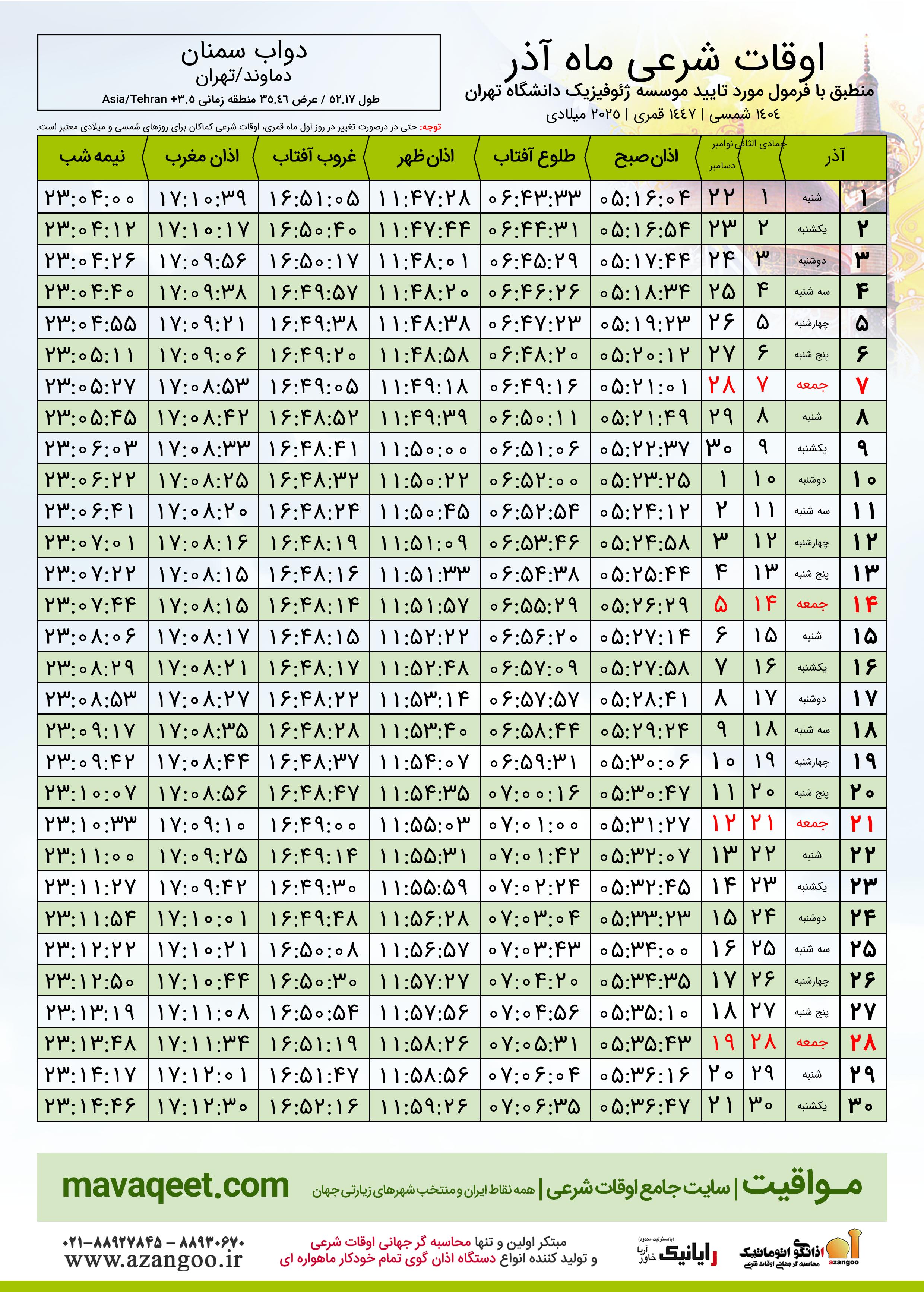 جدول اوقات شرعی آذر ١٤٠٤ شمسی شهر دواب سمنان