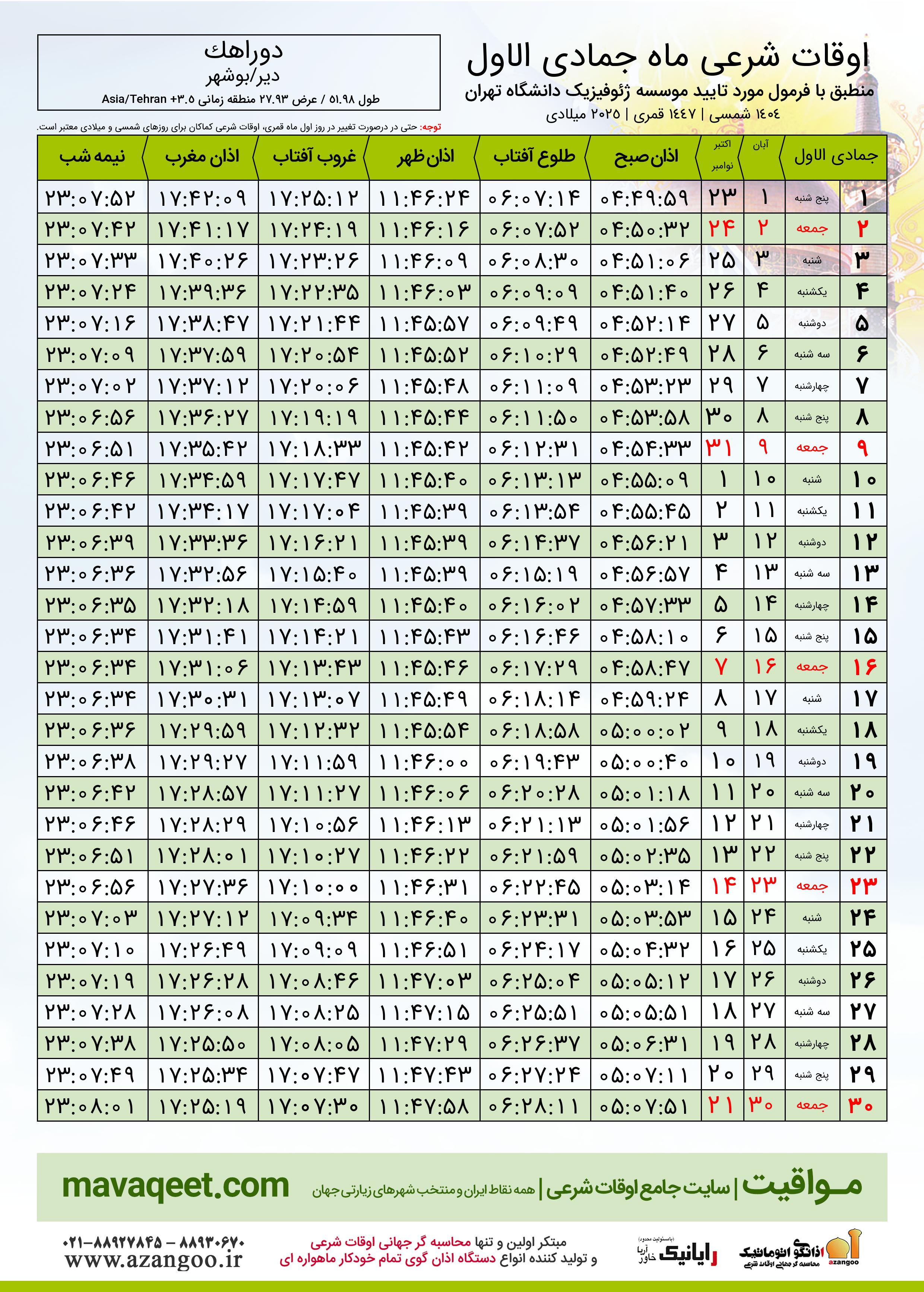 جدول اوقات شرعی جمادی الاول ١٤٤٧ قمری شهر دوراهک