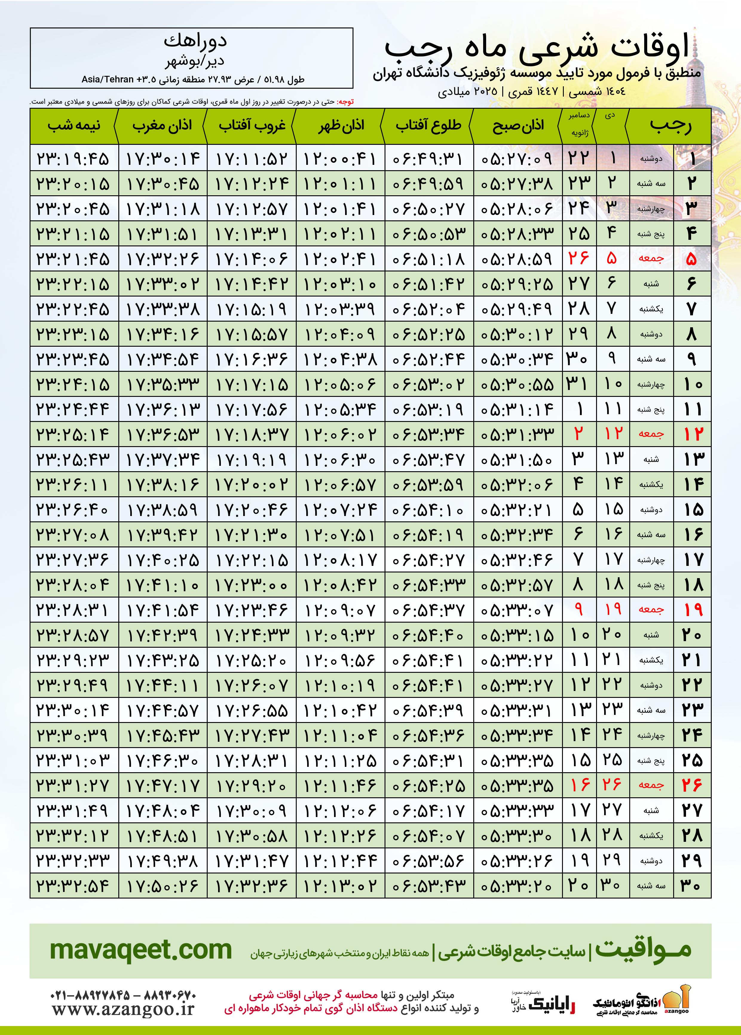 اوقات شرعی ماه رجب ١٤٤٧ هـ.ق شهر دوراهک بر