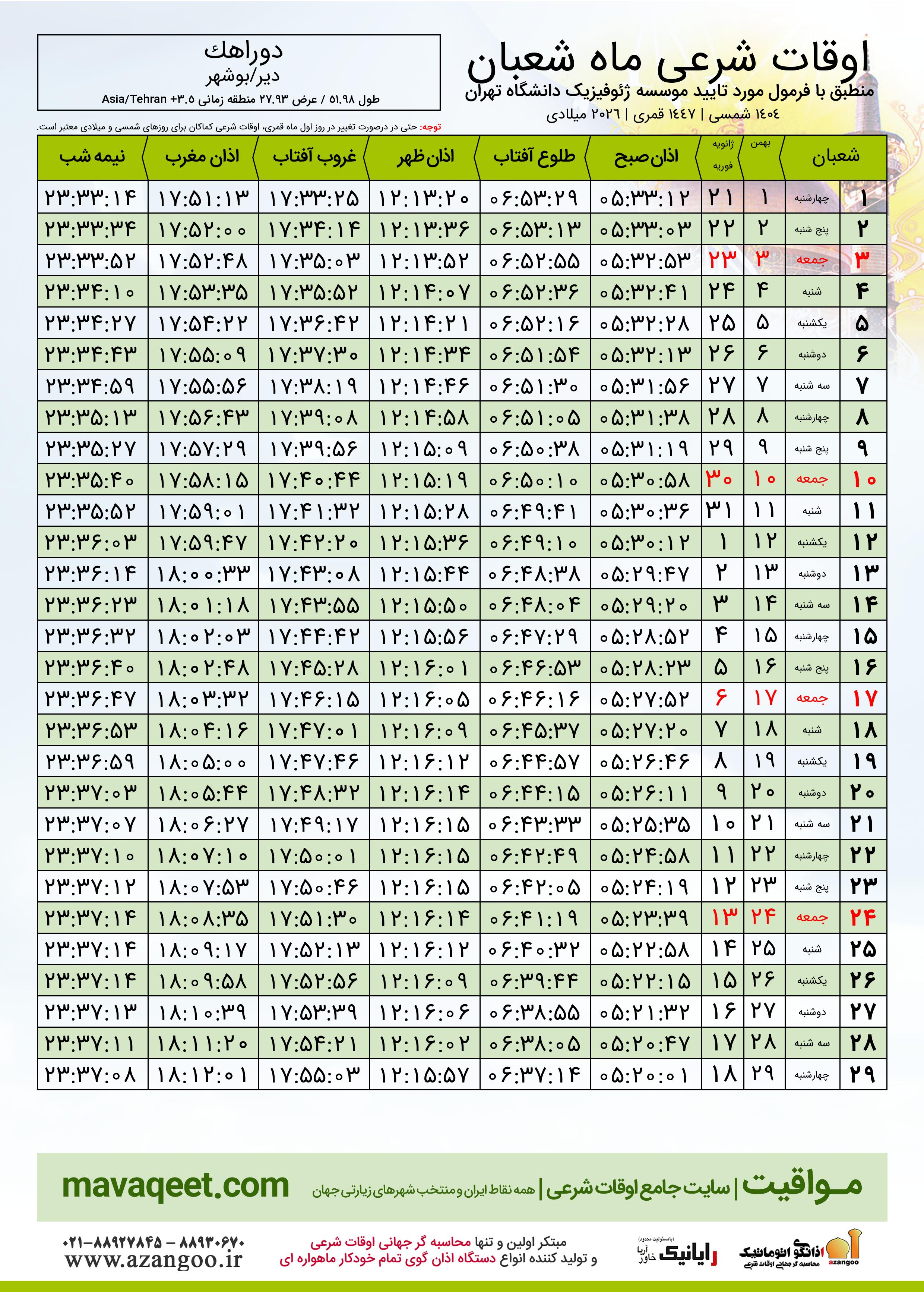 اوقات شرعی ماه شعبان ١٤٤٧ هـ.ق شهر دوراهک بر