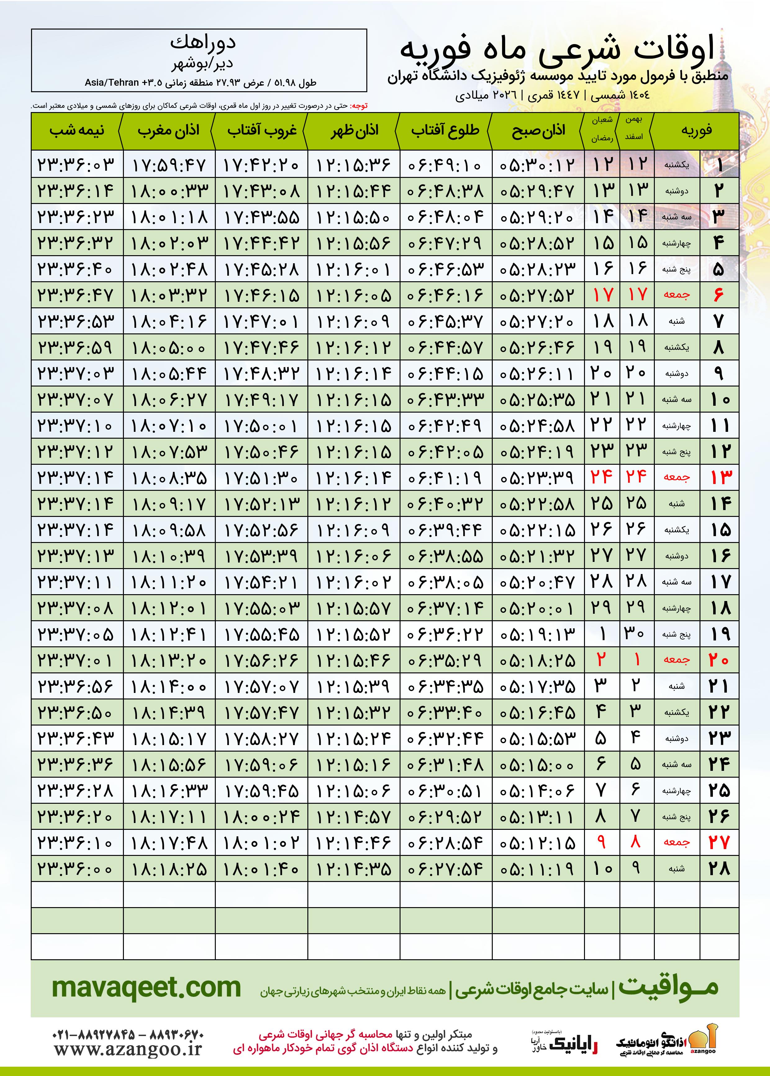 دانلود اوقات شرعی ماه رمضان ٠٤ - ١٤٠٤ شمسی | ٢٠٢٦ میلادی | ١٤٤٧ قمری شهر دوراهک