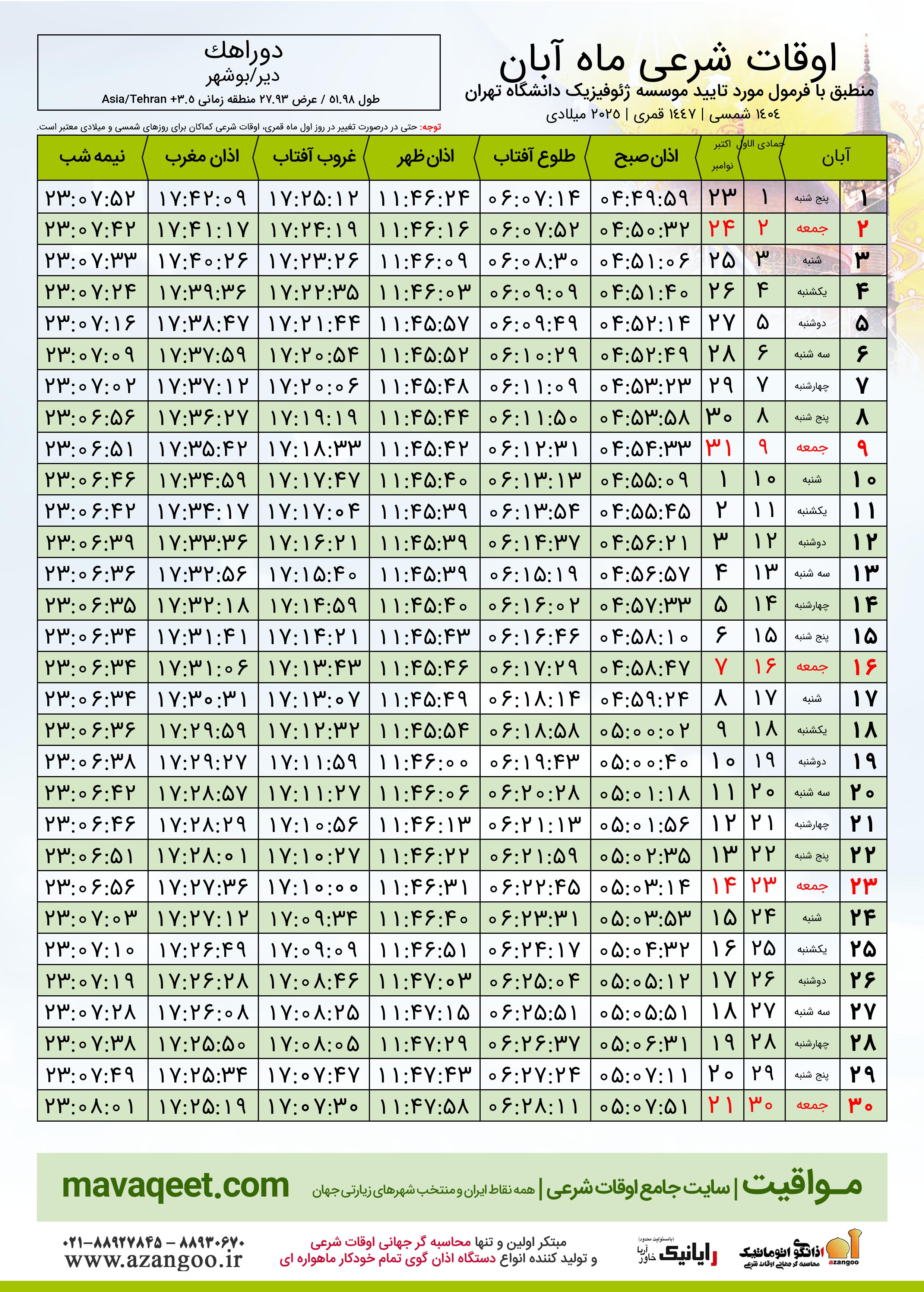 جدول اوقات شرعی آبان ١٤٠٤ شمسی شهر دوراهک