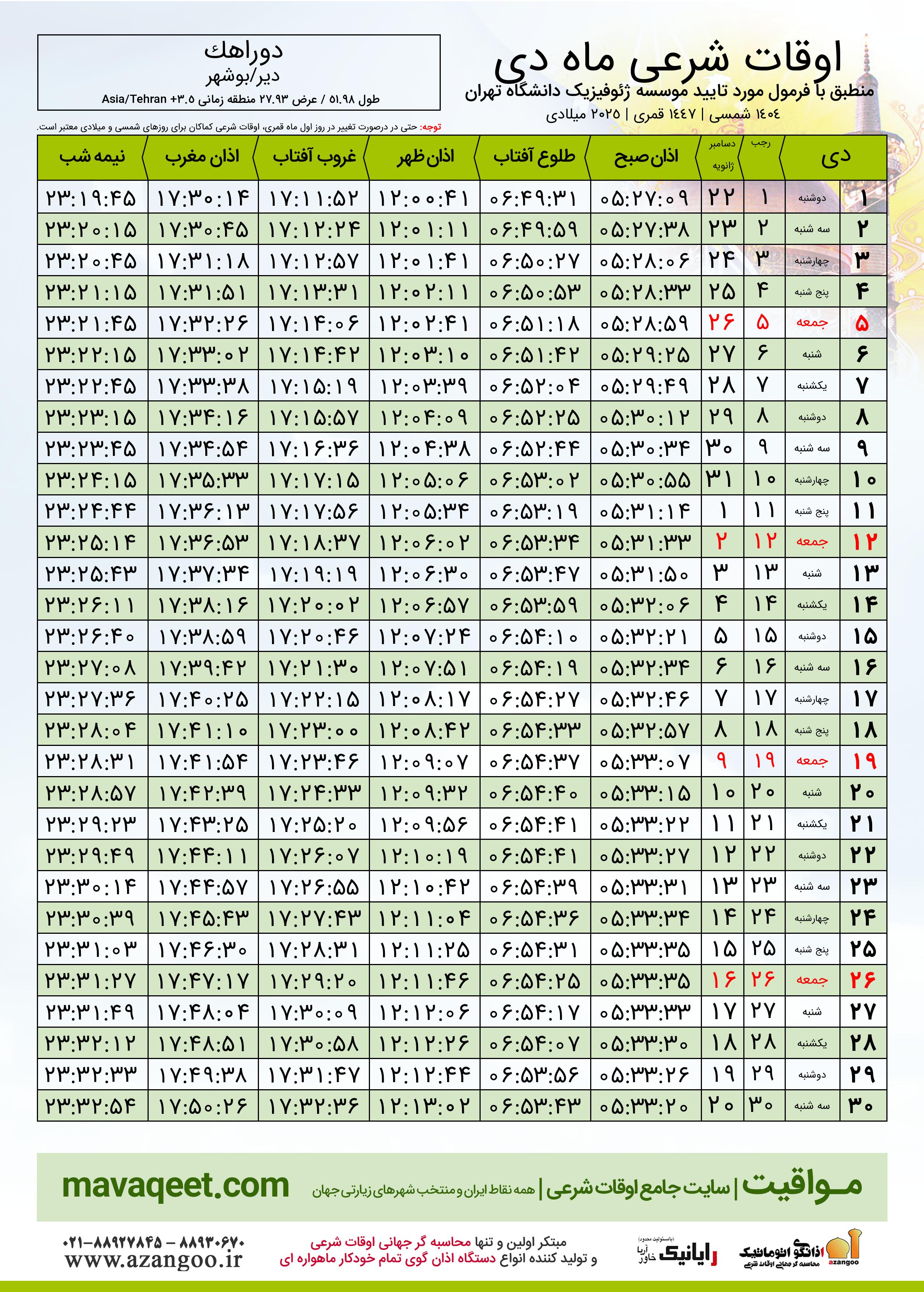 اوقات شرعی دی ١٤٠٤ شمسی شهر دوراهک