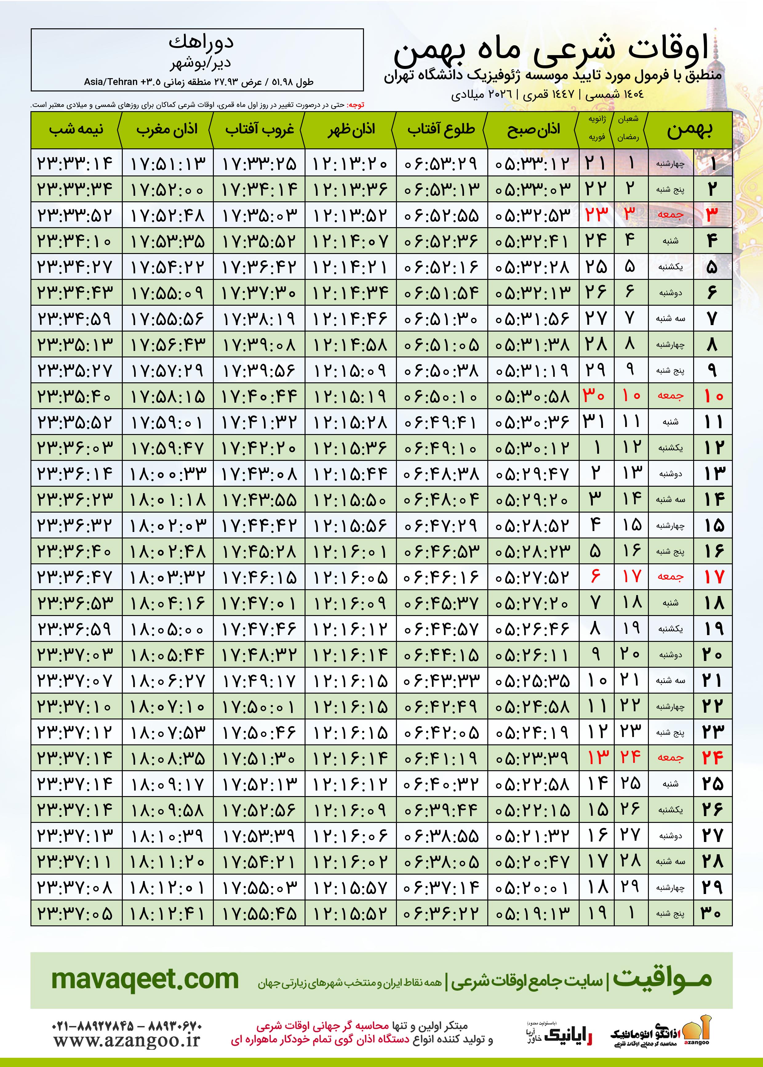 دانلود اوقات شرعی بهمن ٠٤ - ١٤٠٤ شهر دوراهک