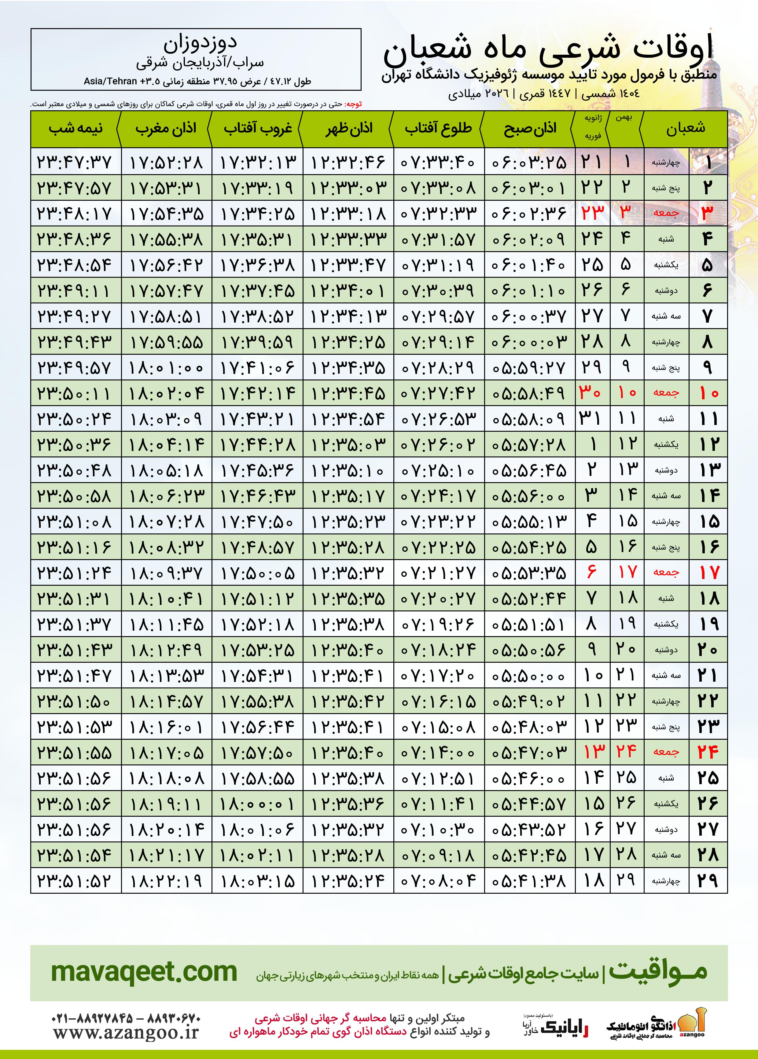 اوقات شرعی شعبان ١٤٤٧ قمری شهر دوزدوزان