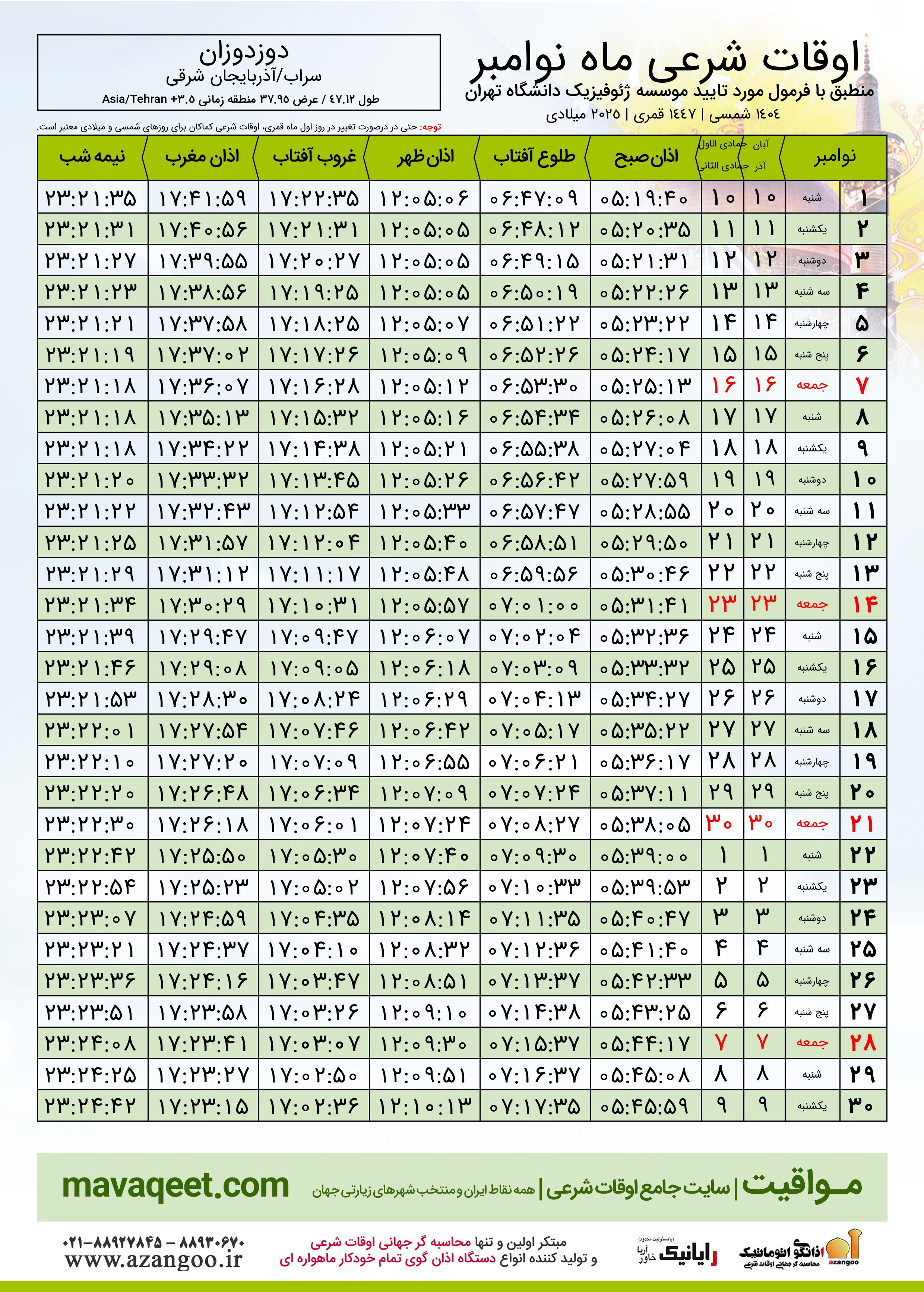 جدول اوقات شرعی نوامبر ٢٠٢٥ میلادی شهر دوزدوزان