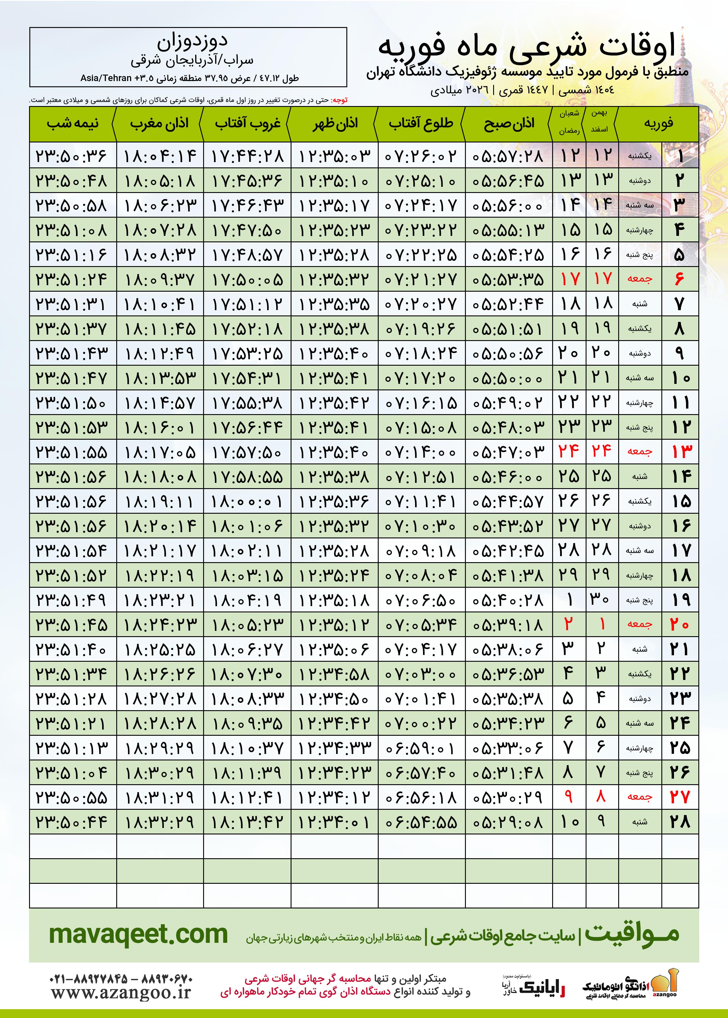 اوقات شرعی ماه رمضان شهر دوزدوزان ١٤٠٤ - ٠٤ شمسی | ٢٠٢٦ میلادی