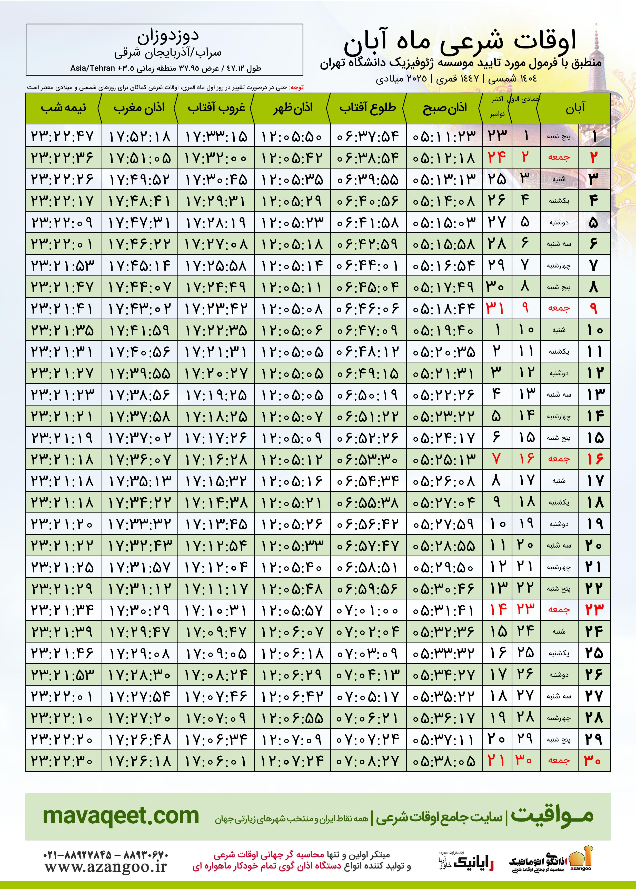 جدول اوقات شرعی آبان ١٤٠٤ شمسی شهر دوزدوزان
