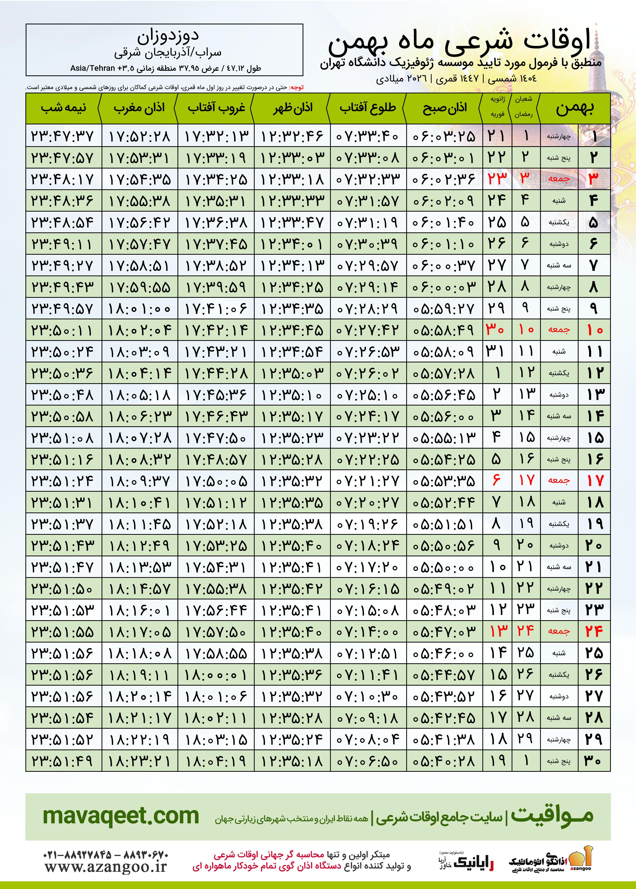 دانلود اوقات شرعی بهمن ٠٤ - ١٤٠٤ شهر دوزدوزان